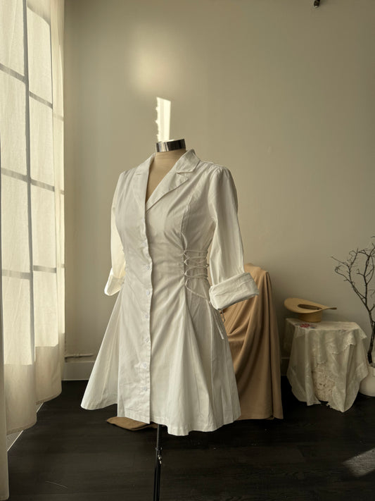 Loran Cotton Side Corset Button Down Long Sleeve Dress In White