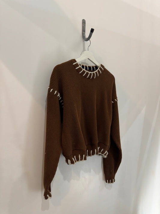 Sloppy Joe Handcrafted Cowboy Blanket Stitch Chunky Sweater In Brown