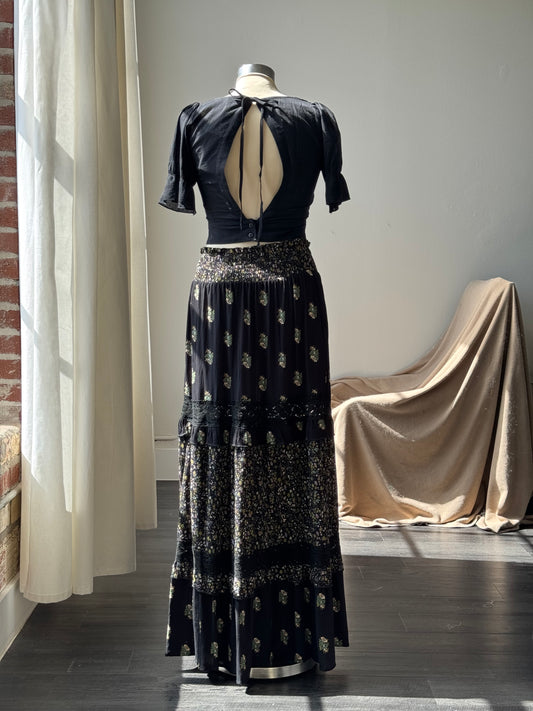 Teagan Hidden Pocket Tiered Floral Maxi Skirt In Forest Black