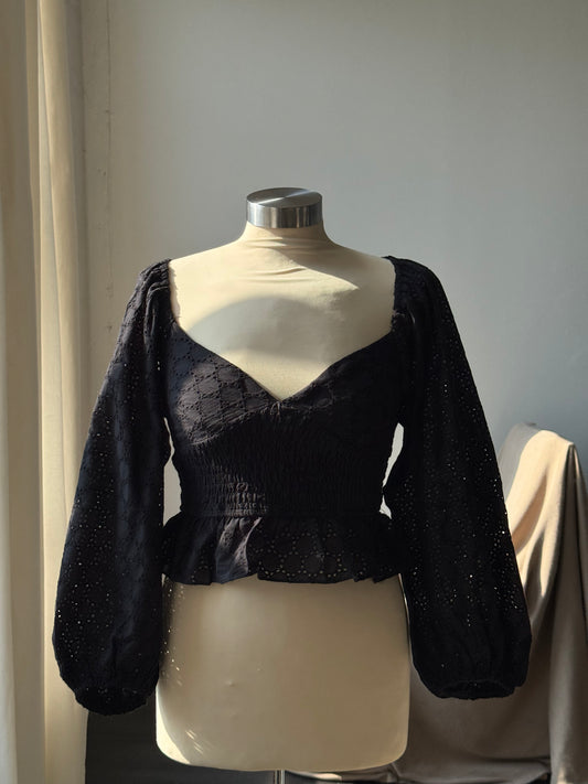 Carmen Cotton Eyelet Balloon Sleeve Crop Top In Black