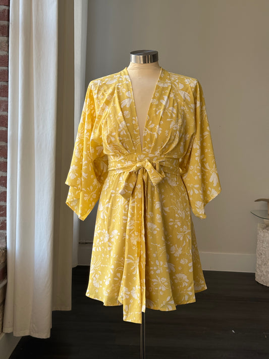 Kinsey Floral Kimono Tie Front Dress In Lemon