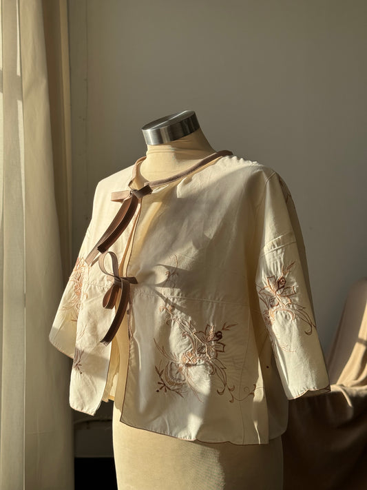 Judy Handcrafted Vintage Embroidered Tie Front Top In Cream