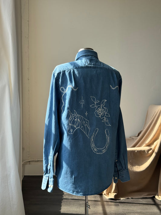Jaxson Handcrafted Embroidered Button Down In Deep Denim