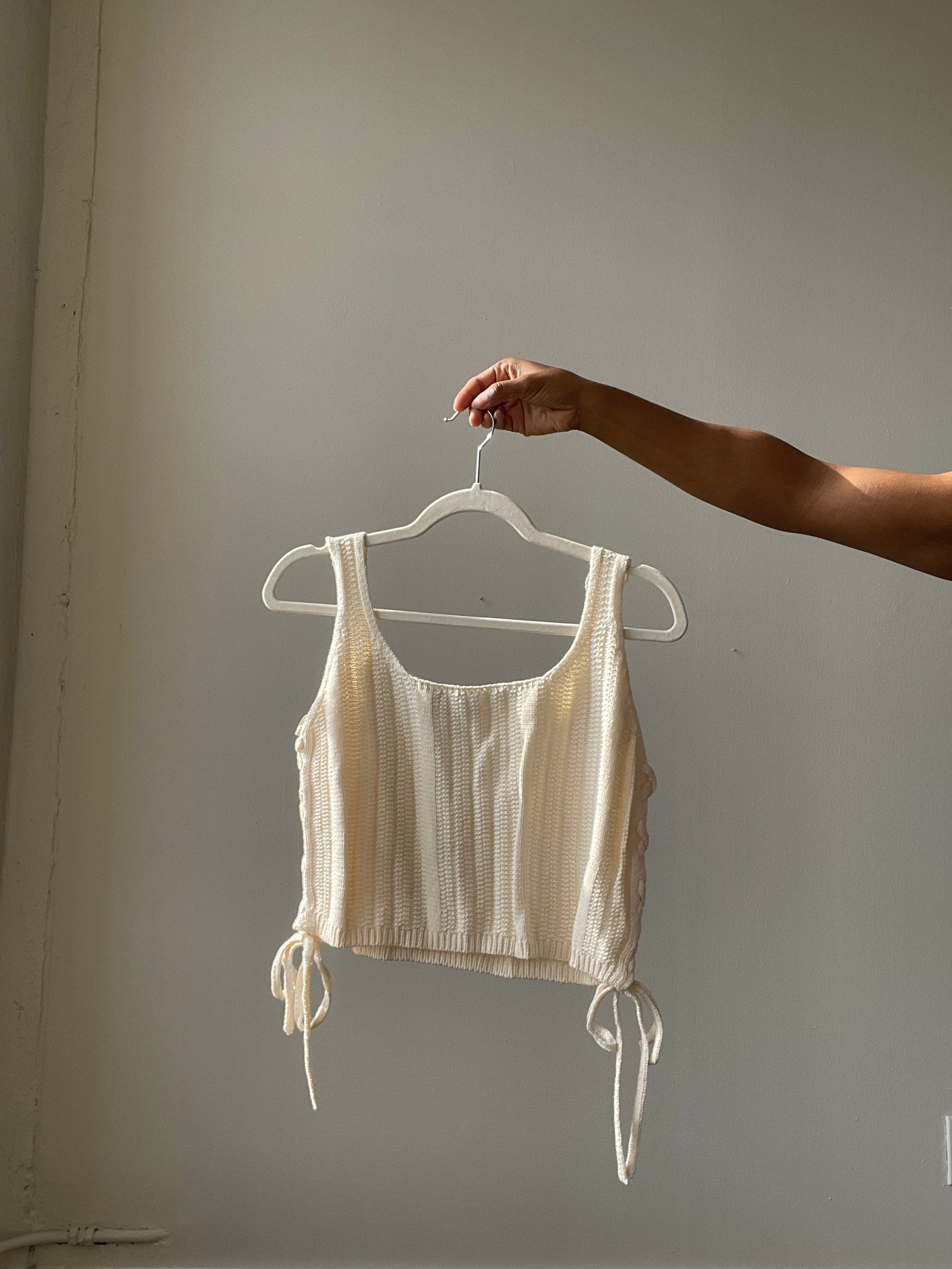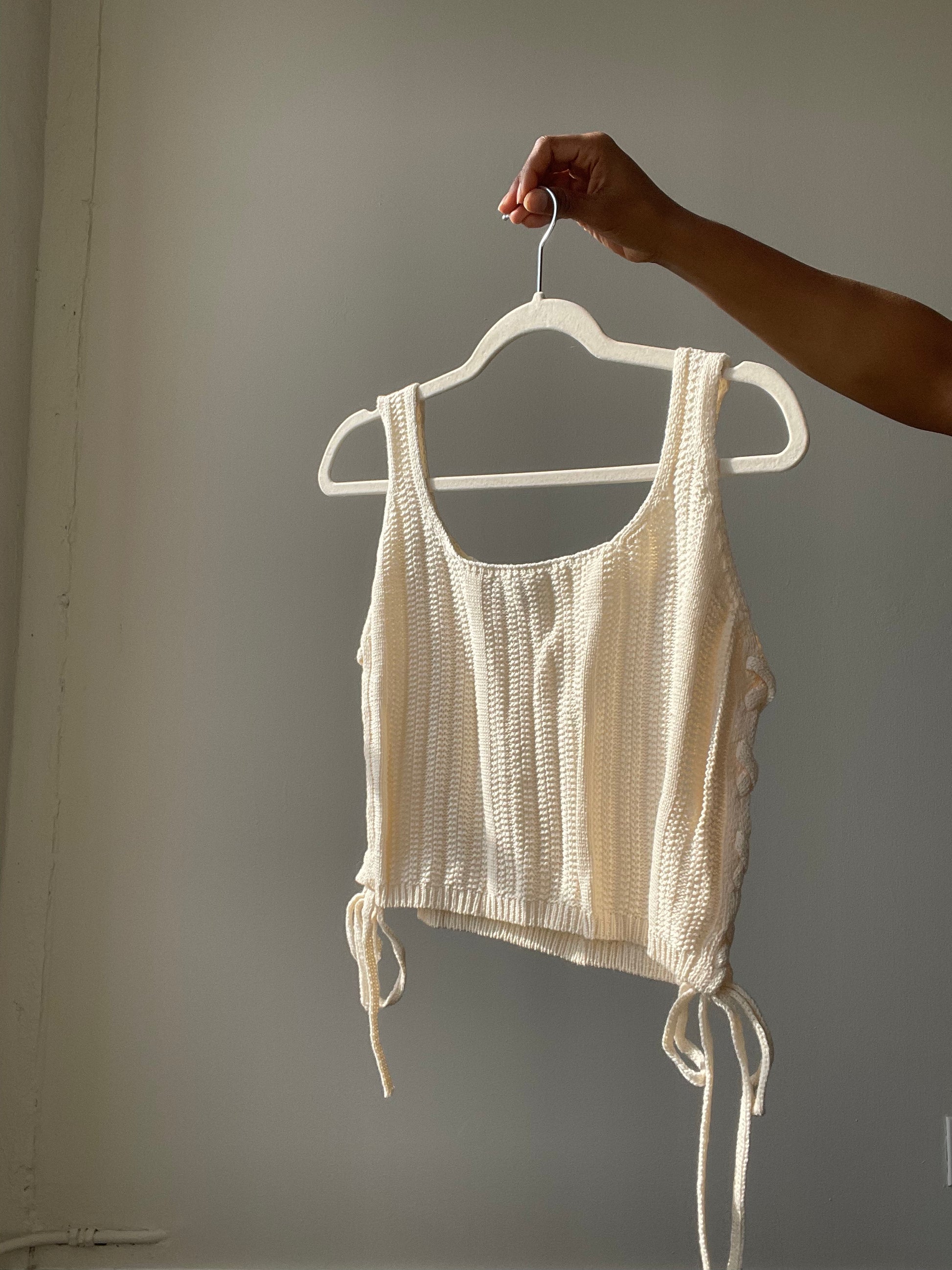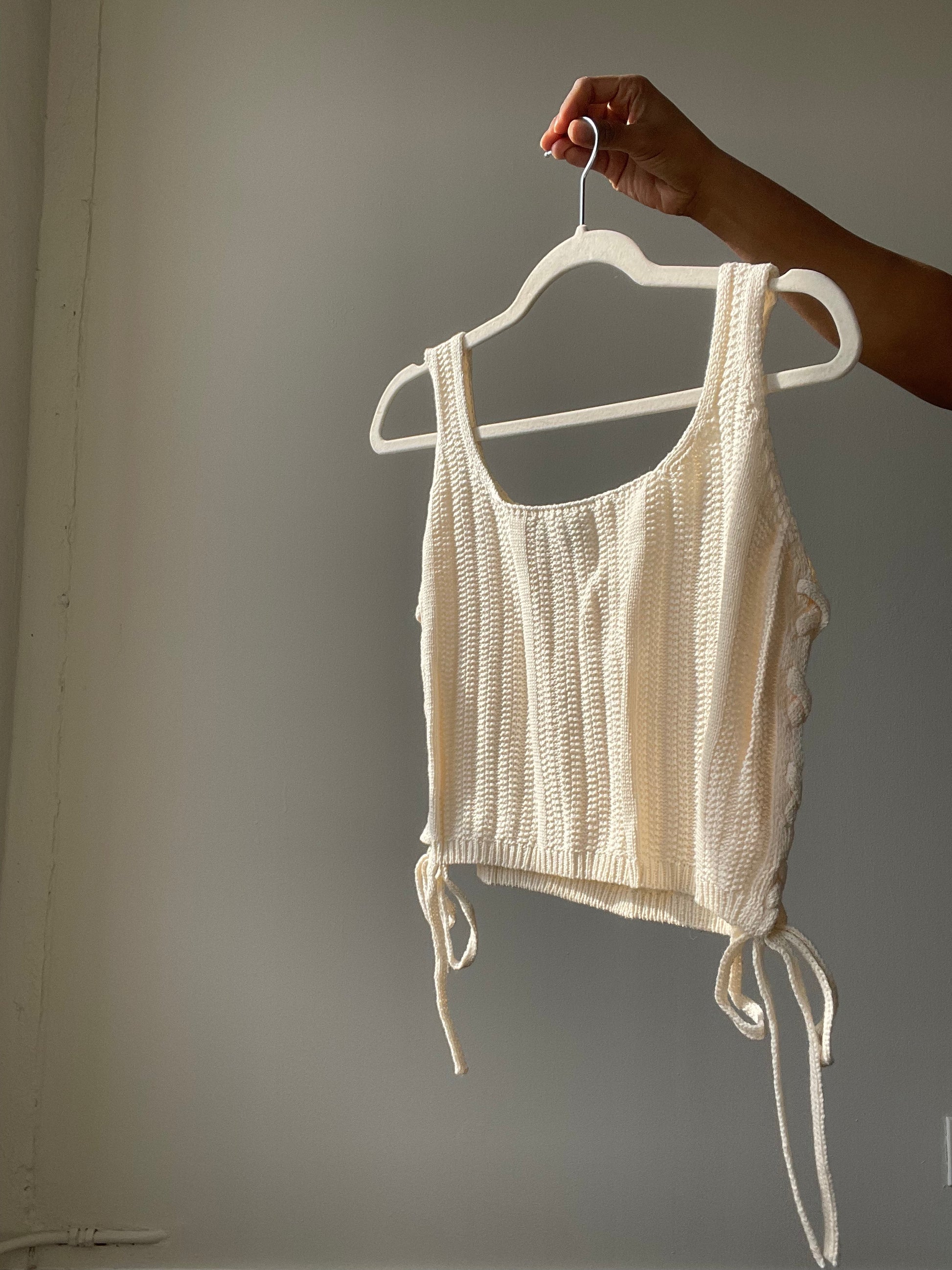 Crafted from soft and breathable cotton knit fabric, this crop top is both comfortable and trendy. The square neckline adds a touch of elegance and sophistication, while the lace-up detailing on the sides adds a playful and edgy vibe.