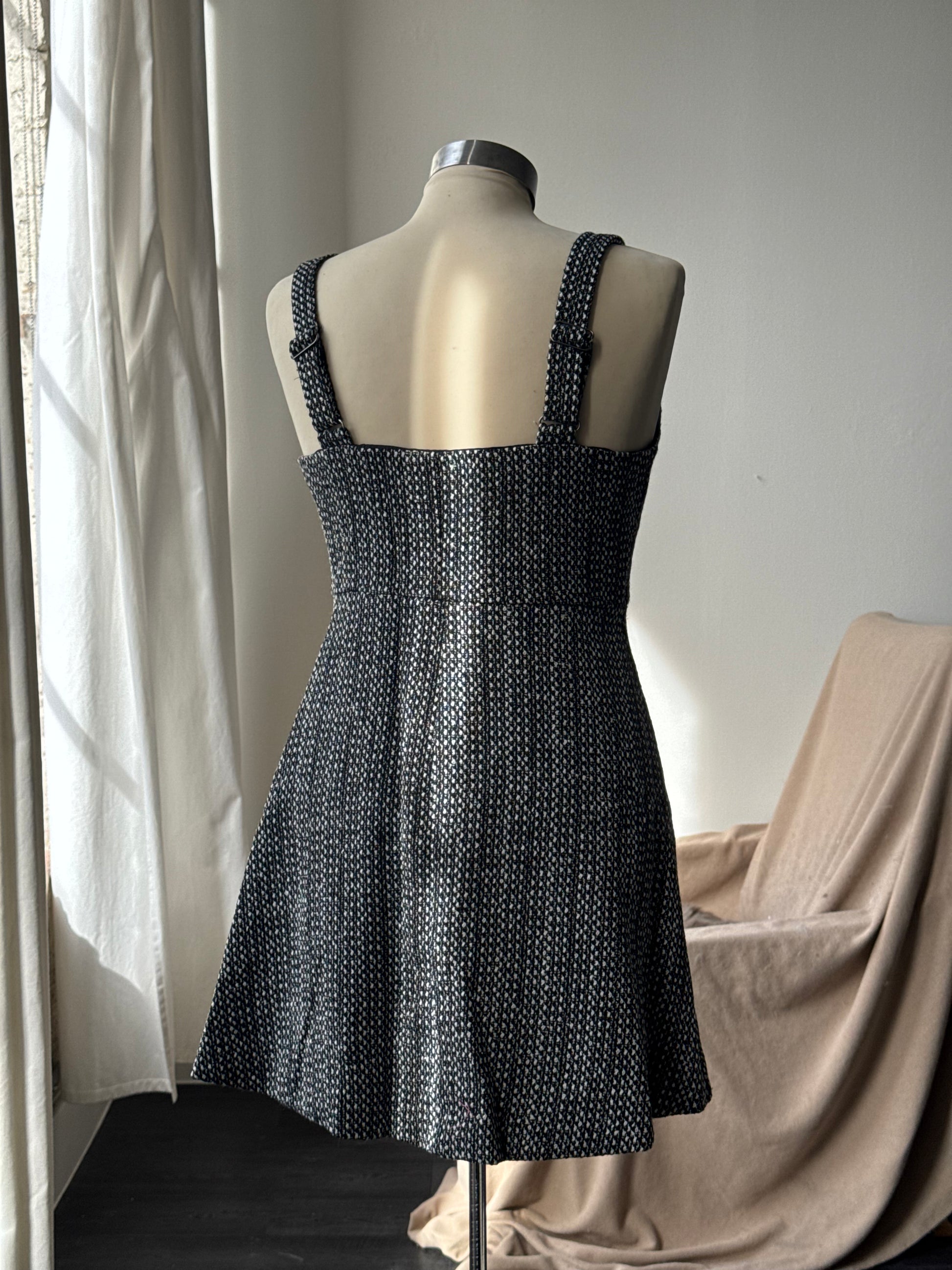 A timeless take on tailored charm. This classic tweed mini dress features a flattering V-neckline and a button-front closure for a polished, vintage-inspired look. Thoughtfully fully lined for comfort and structure, it’s equal parts refined and wearable.