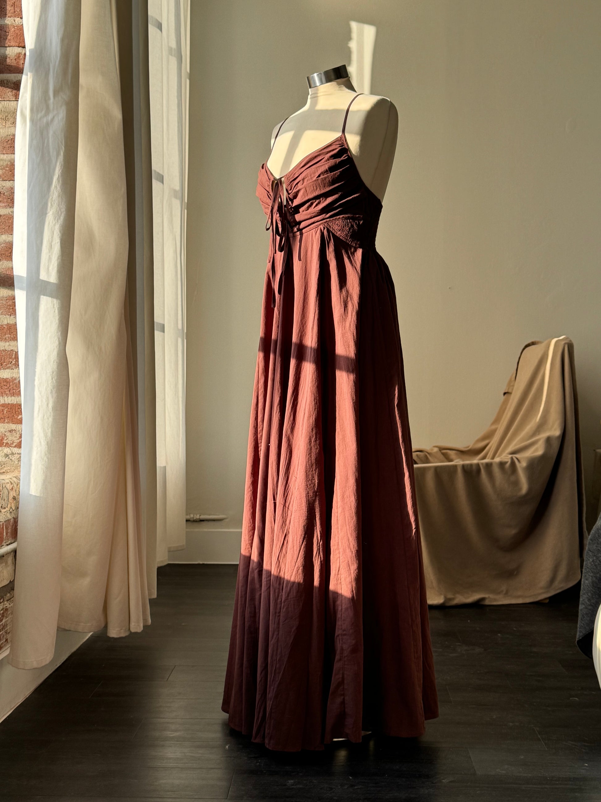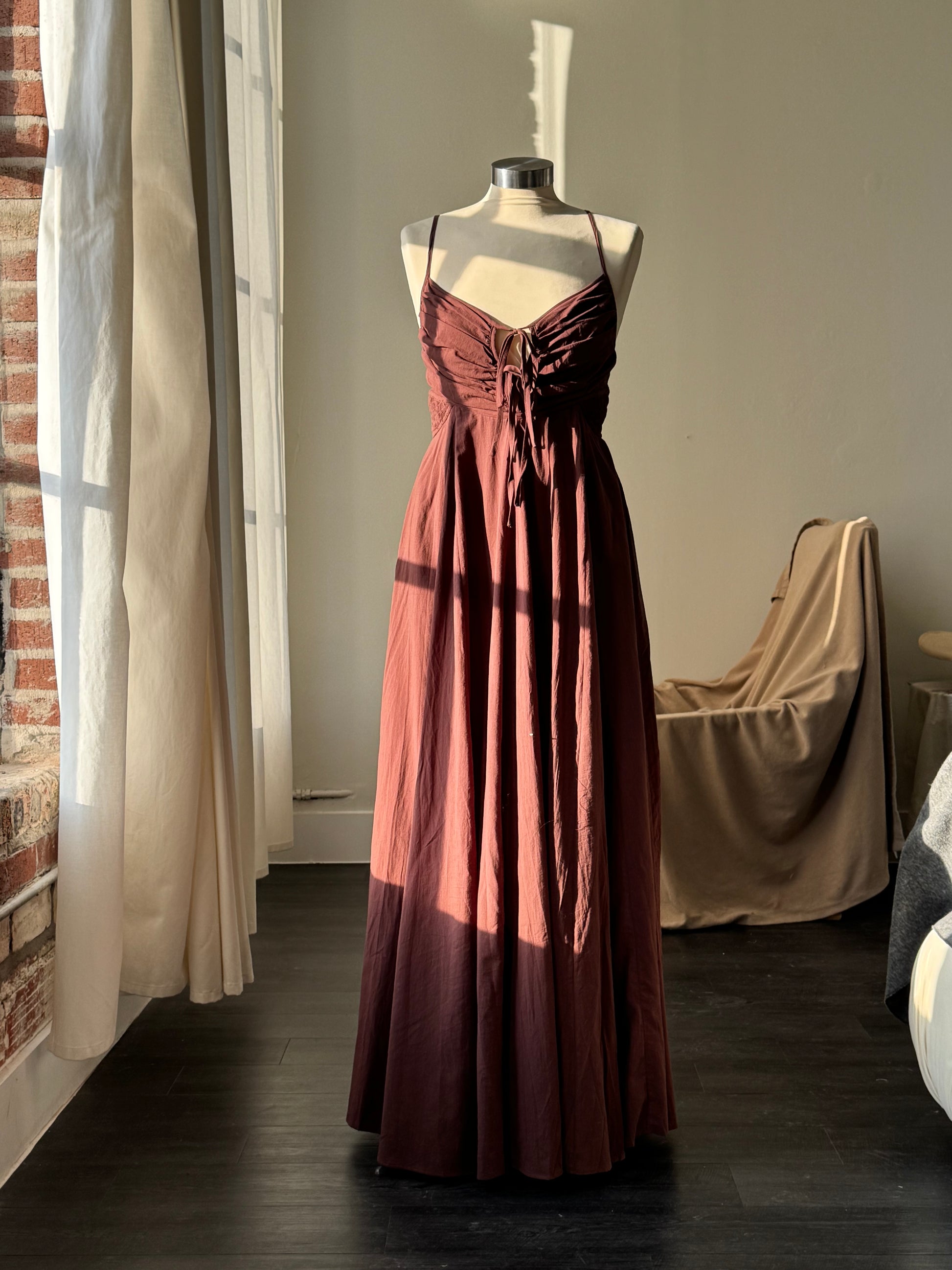 Effortless statement piece. This cotton maxi dress features a softly ruched bust with a flirty peekaboo tie-front, giving it that perfect blend of sweetness and subtle allure. The delicate shoulder straps lead to a stunning open back, finished with adjustable ties for a just-right fit that flatters every curve.
