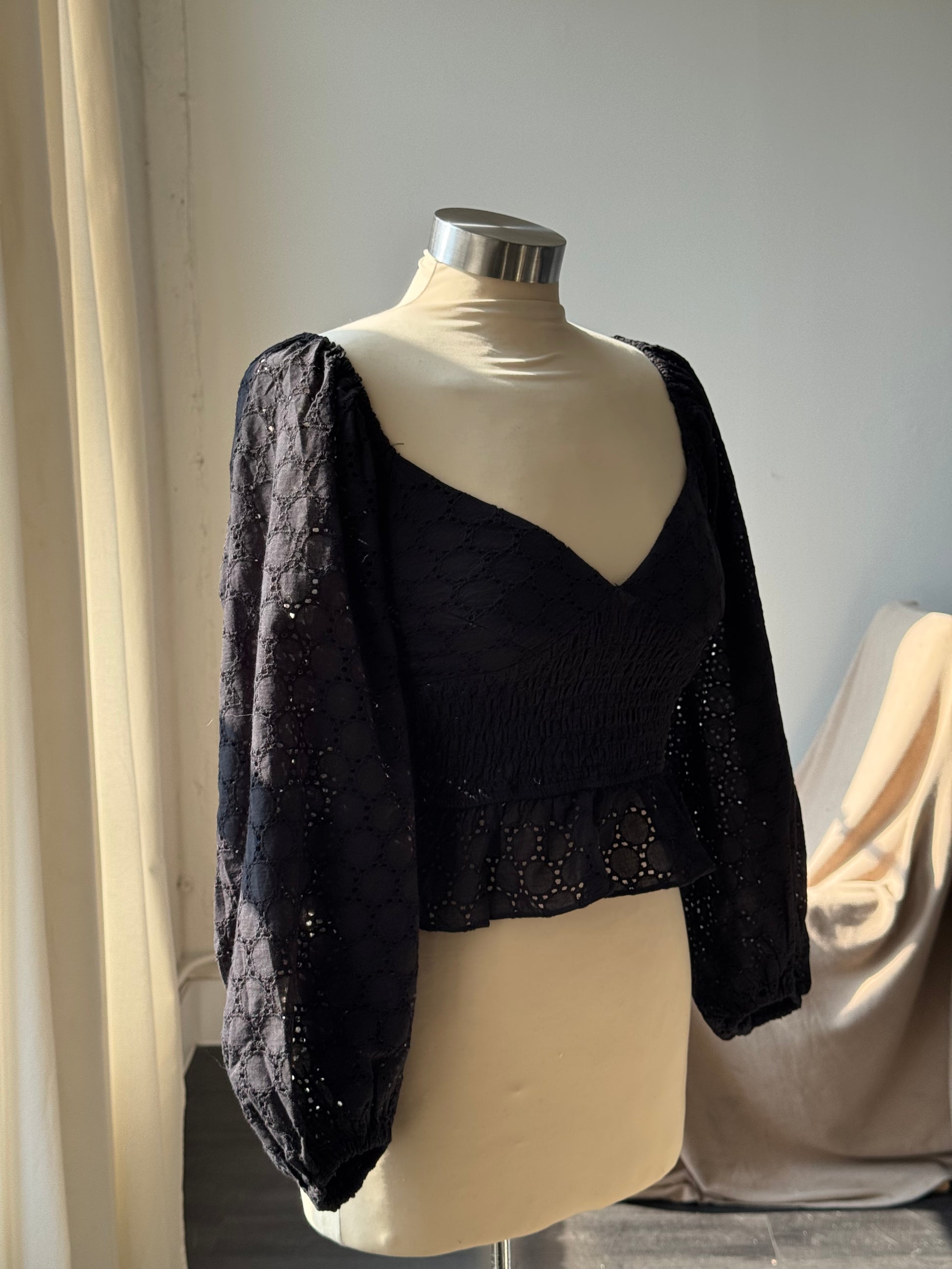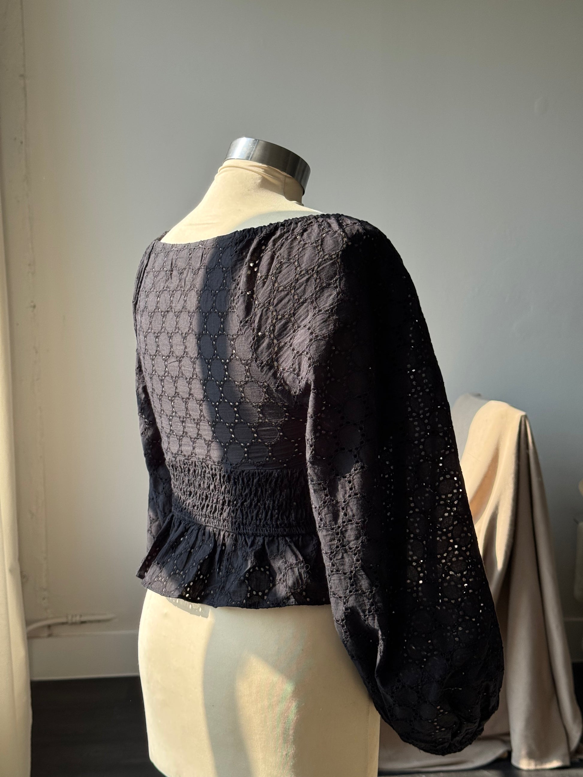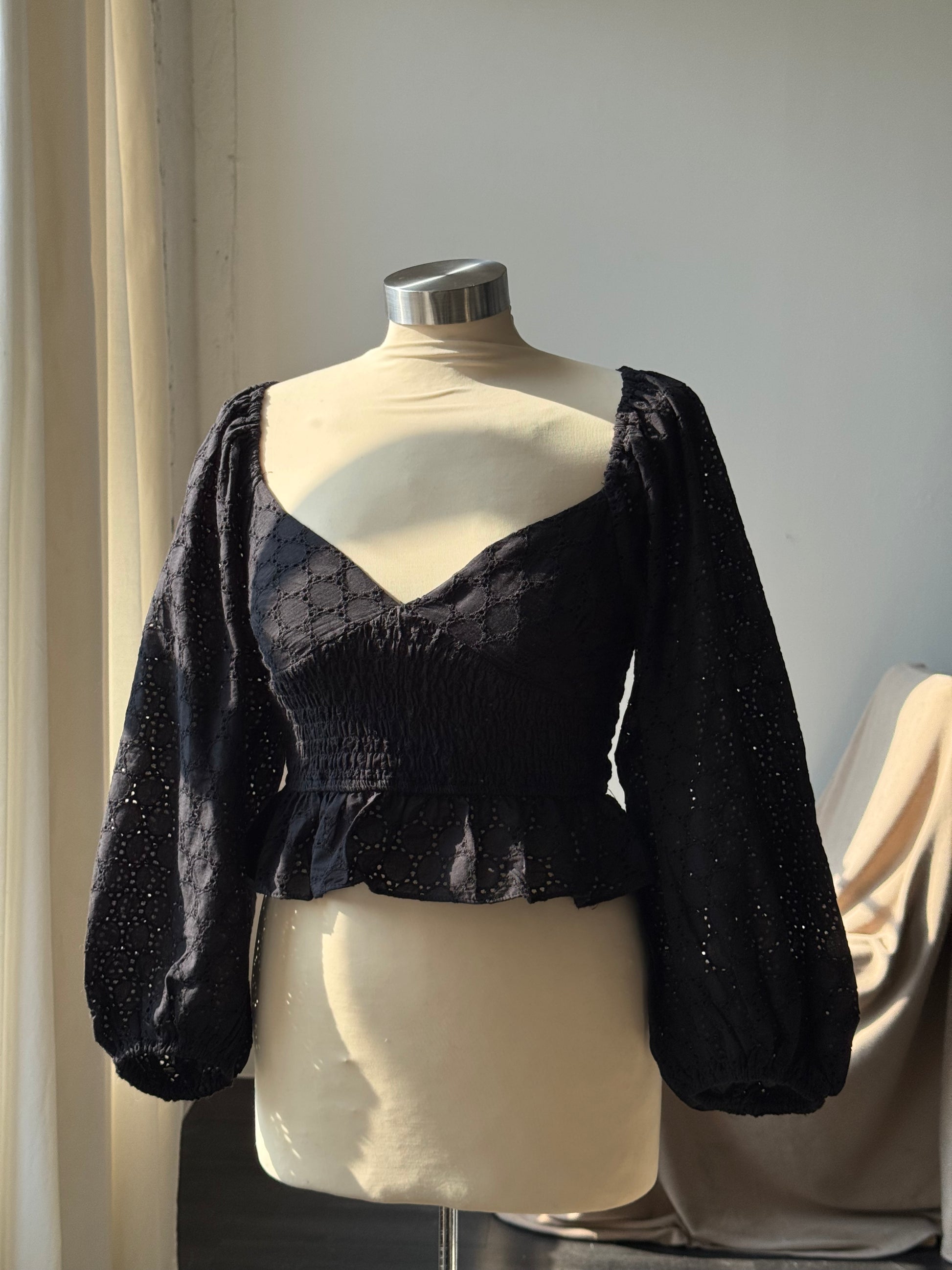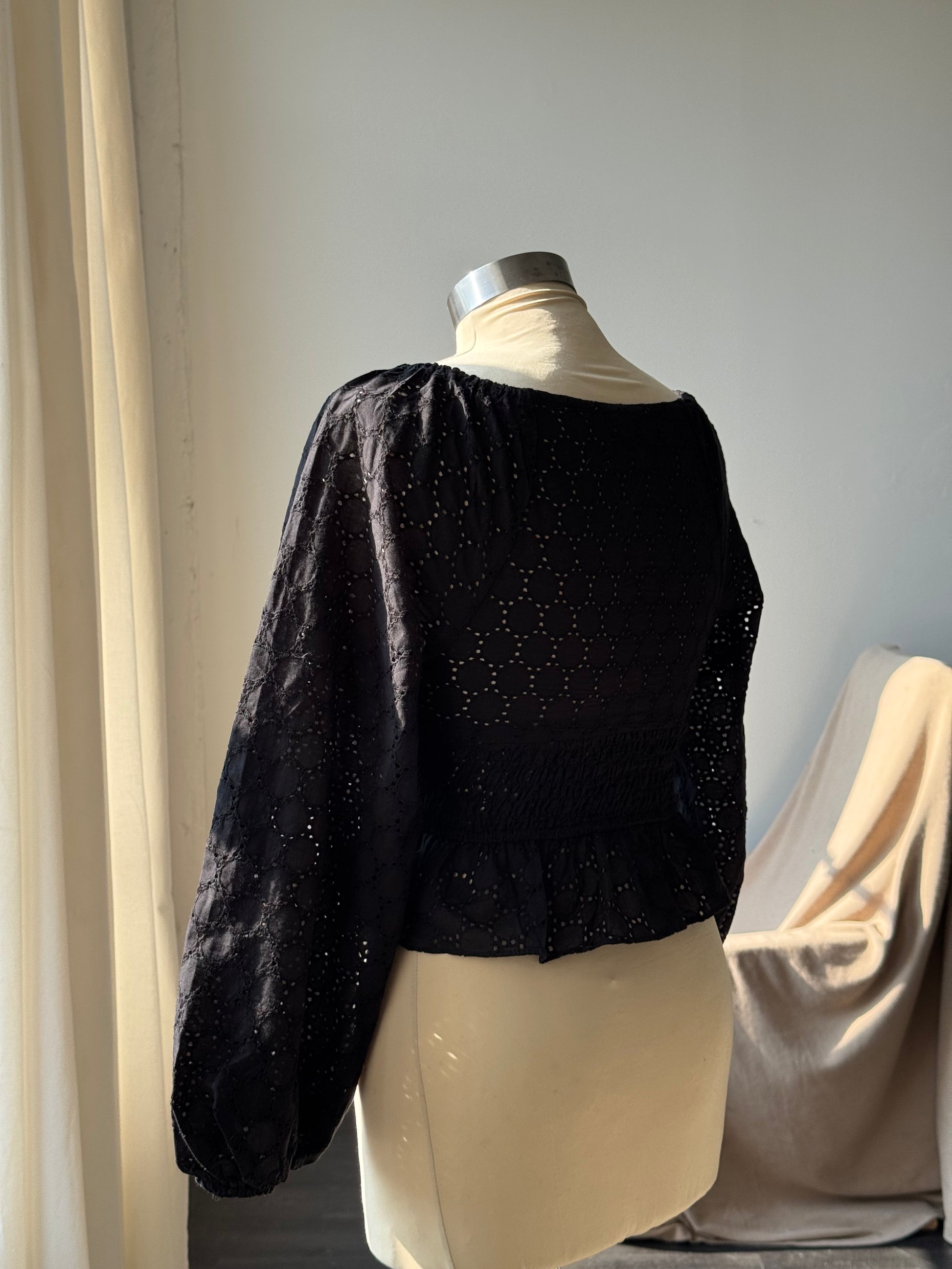 Carmen Cotton Eyelet Balloon Sleeve Crop Top In Black