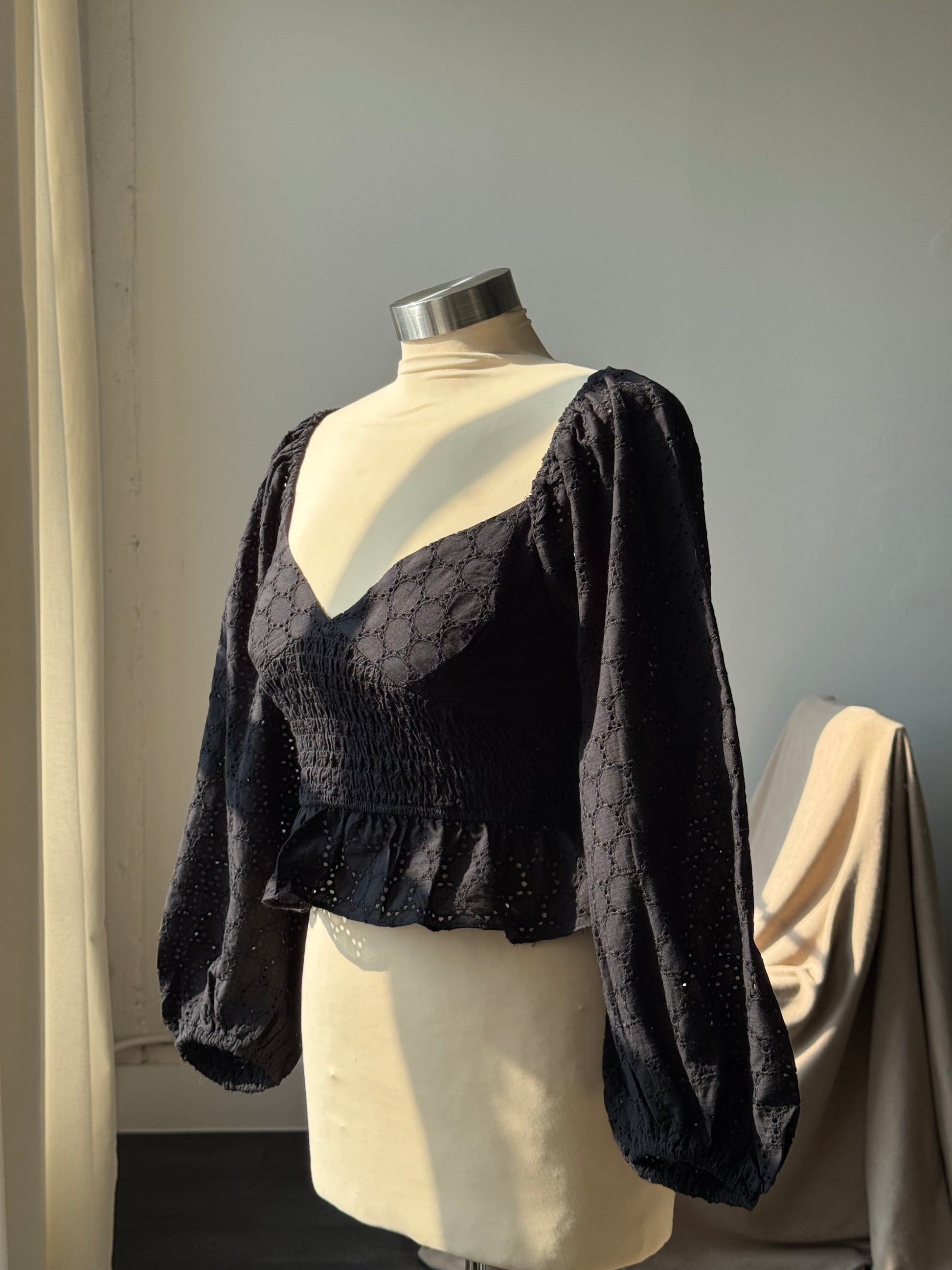 A timeless mix of romance and charm, this crop top is crafted from airy cotton eyelet that feels as good as it looks. The V-neckline frames the décolletage with effortless elegance, while the voluminous balloon sleeves add a touch of vintage drama. Cropped at just the right length, it pairs beautifully with high-waisted denim, skirts, or layered under overalls for a playful twist.