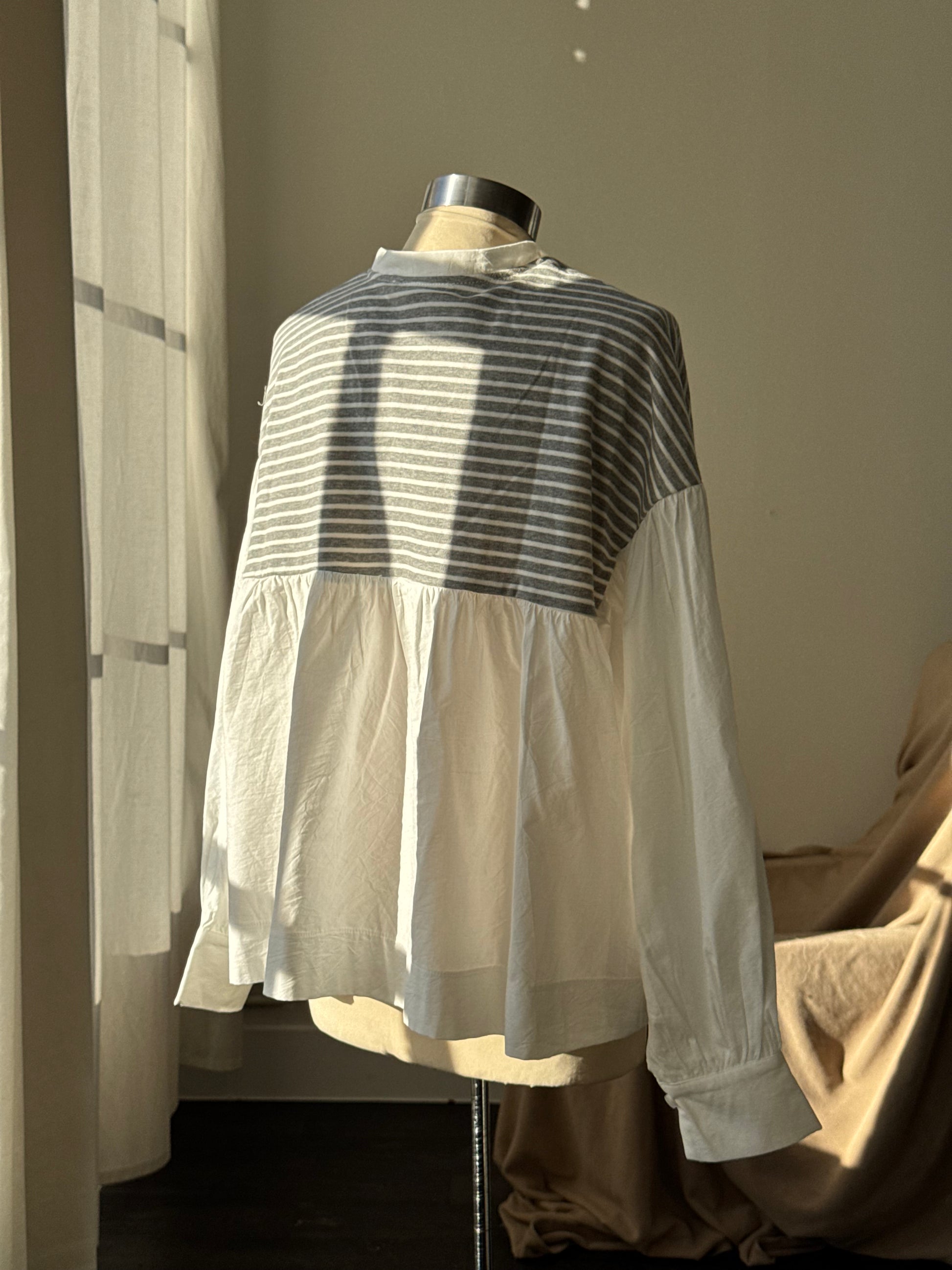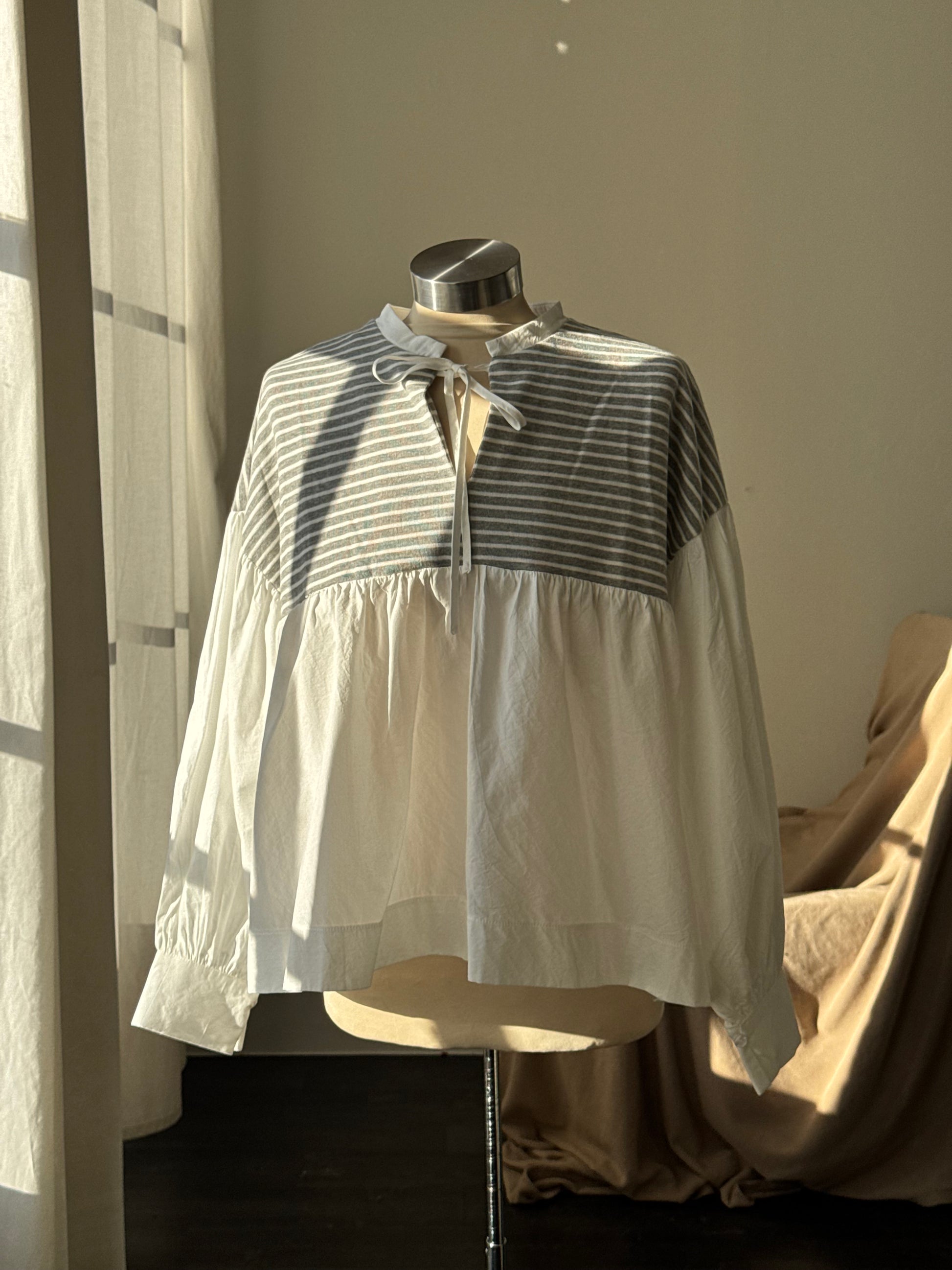 Chasity Cotton Mock Tie Neck Striped Two Tone Top In Grey