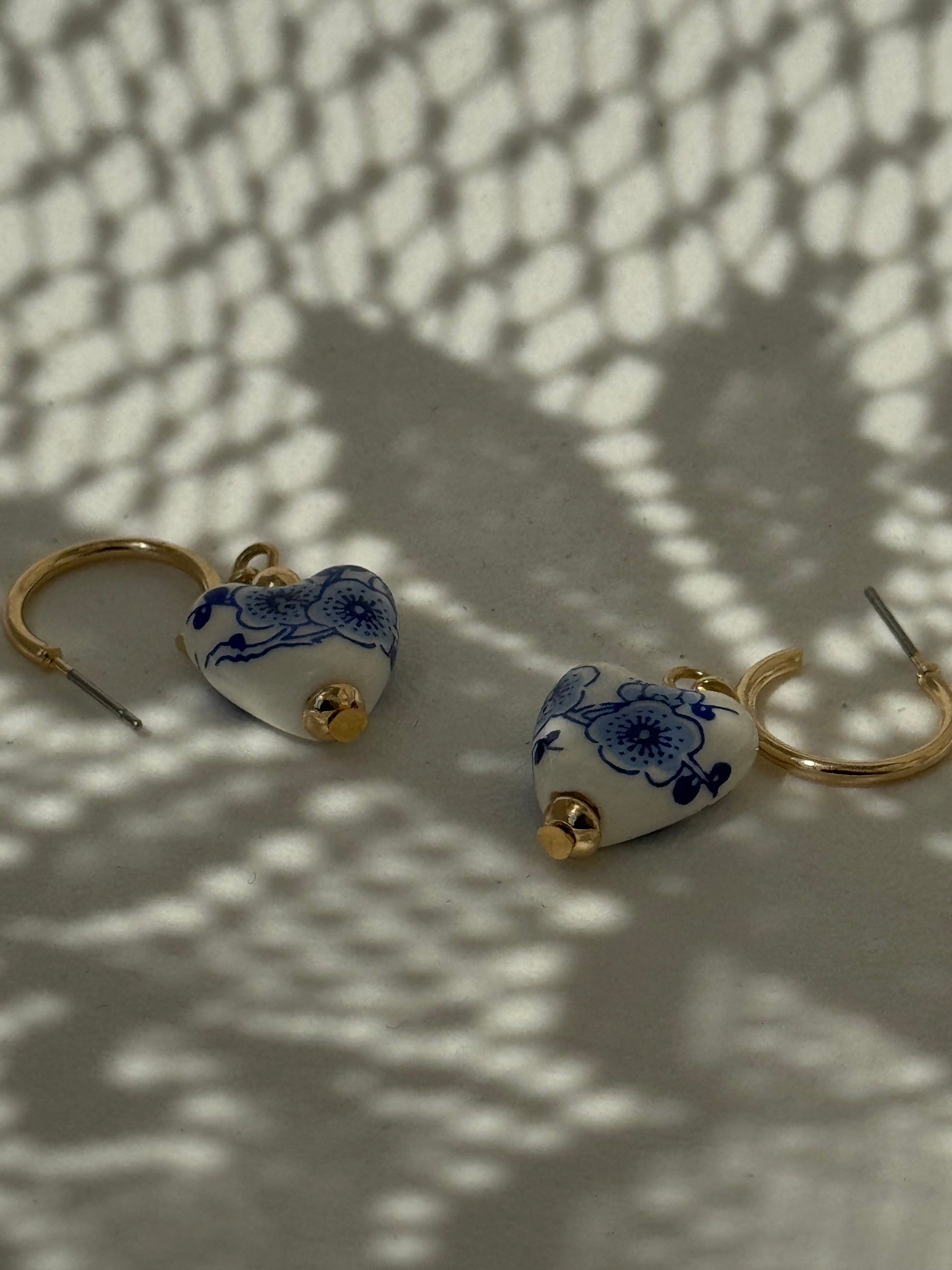 China glass charm drop hoop earrings. Featuring delicate China glass beads that shimmer with vintage-inspired elegance, each charm dangles effortlessly from a sleek, gold-tone hoop. The lightweight design offers all-day comfort while adding a subtle pop of color and artistry to your look. Perfect for dressing up casual outfits or adding a touch of charm to special occasions.