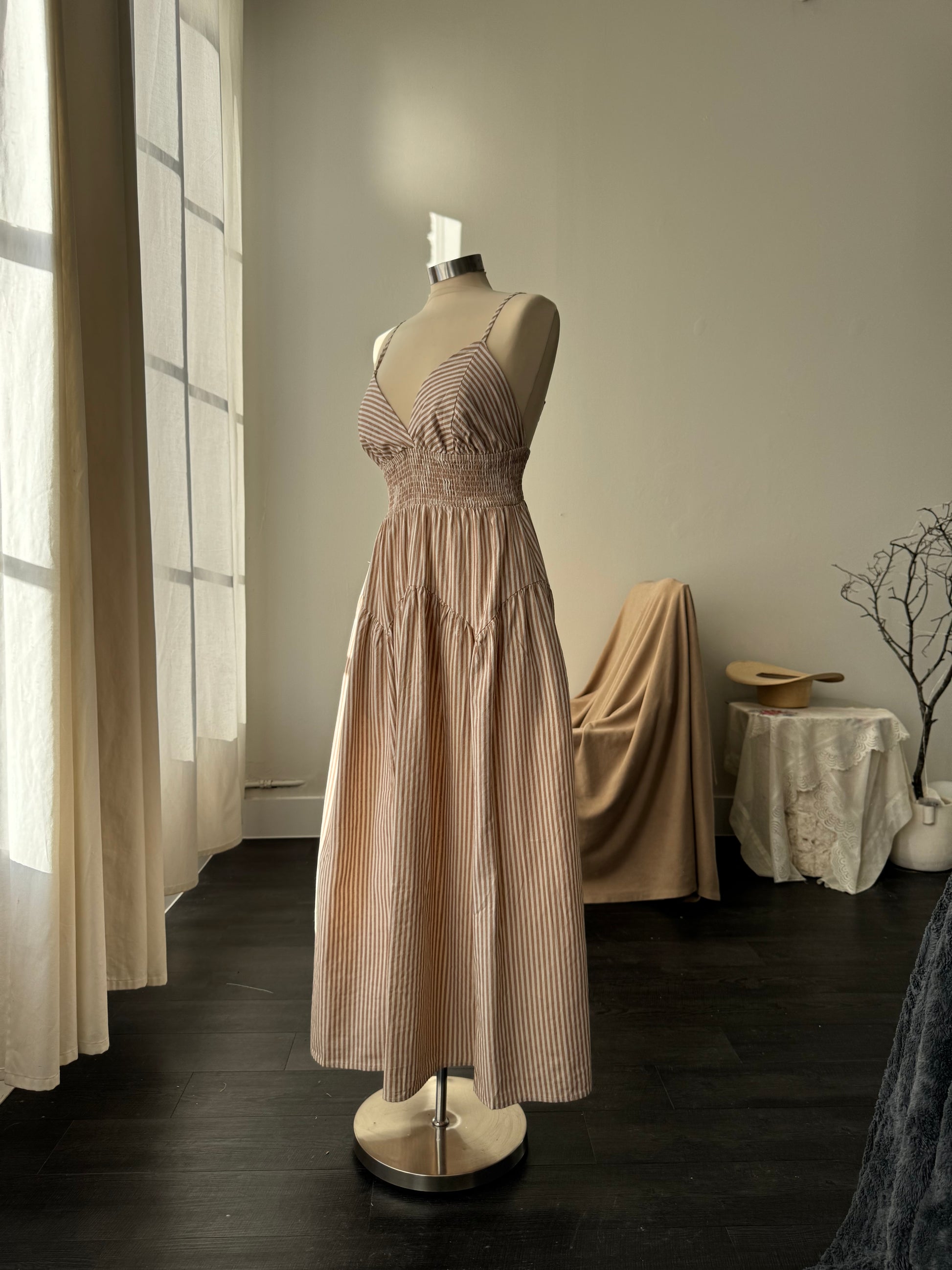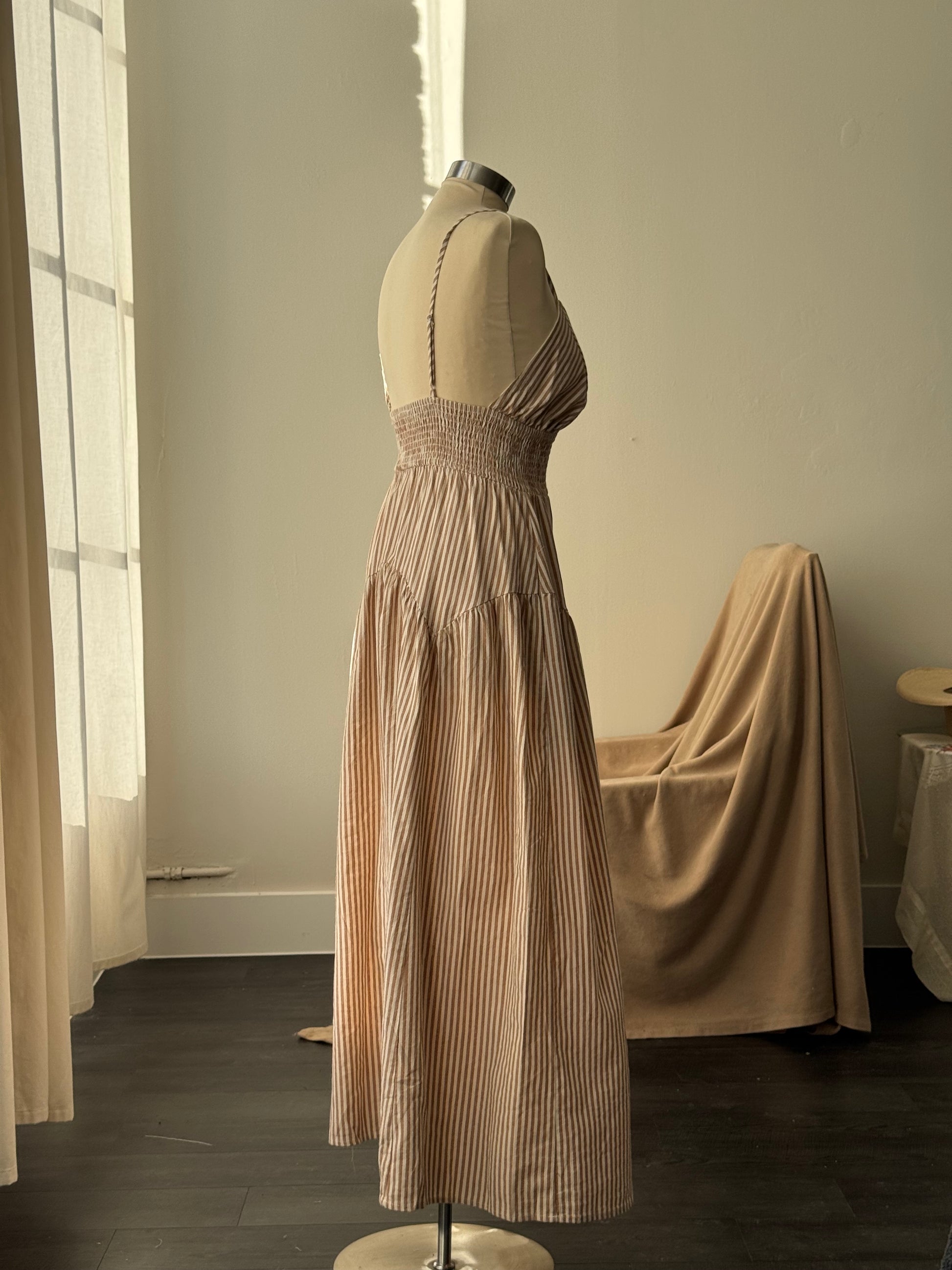 Cherie Cotton Striped Midi Dress In Mocha