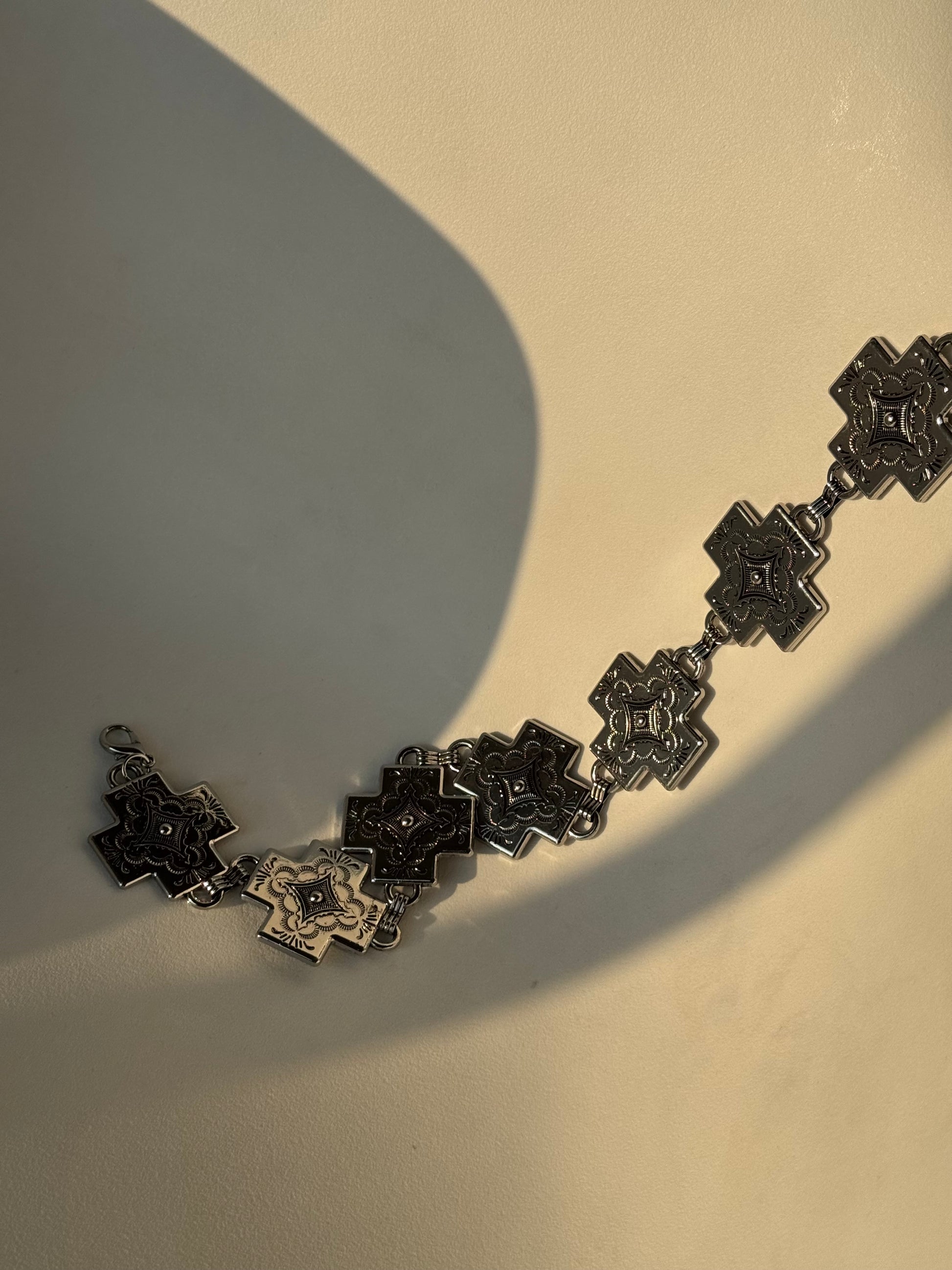 A subtle statement piece that blends edge with elegance. The Mini Cross Chain Belt features a delicate series of interlinked chains adorned with petite cross charms, offering just the right balance of shine and movement. Designed to sit comfortably at the waist or hips, it adds a touch of Western-inspired detail to dresses, denim, or layered over oversized button-downs.
