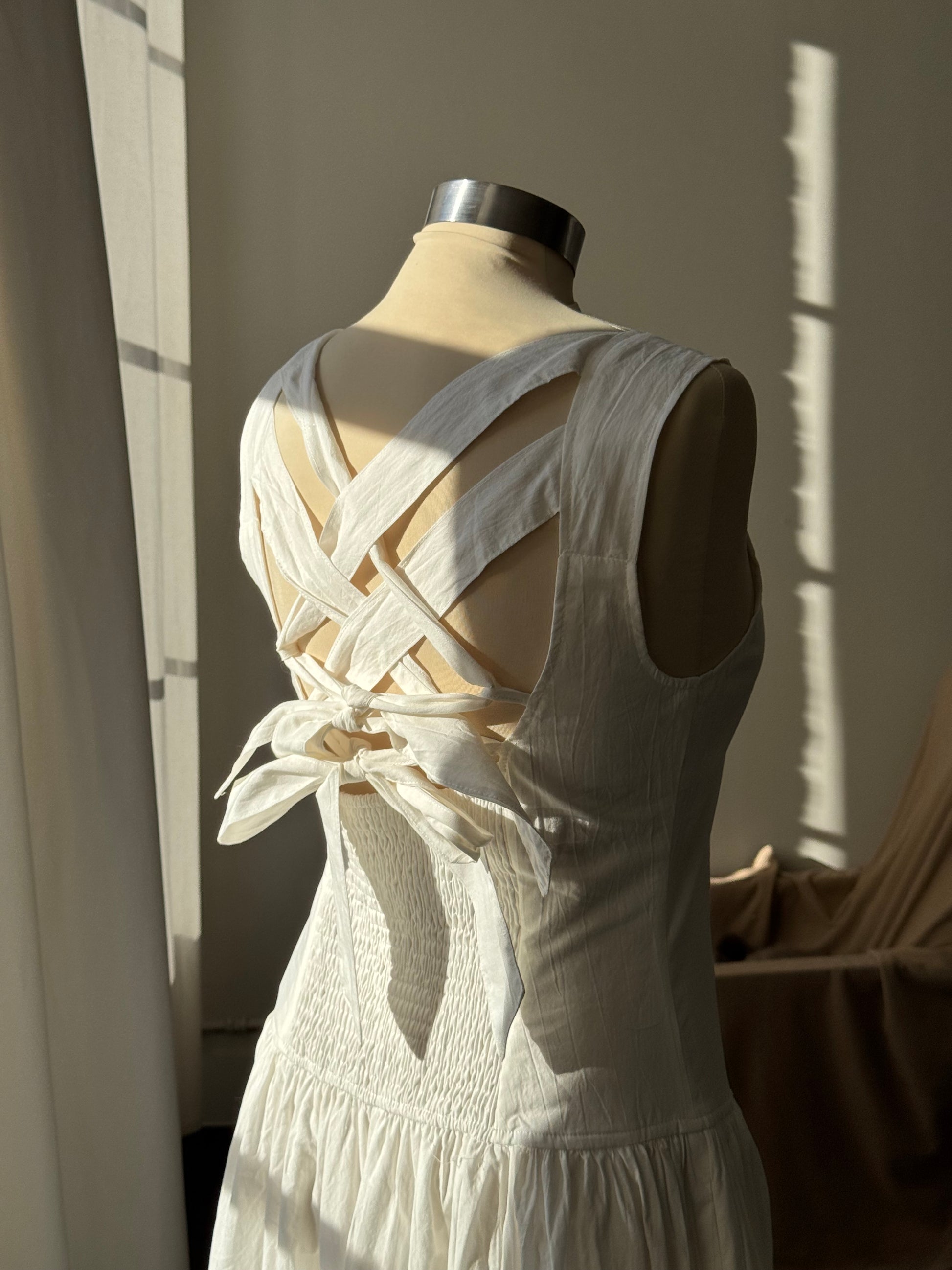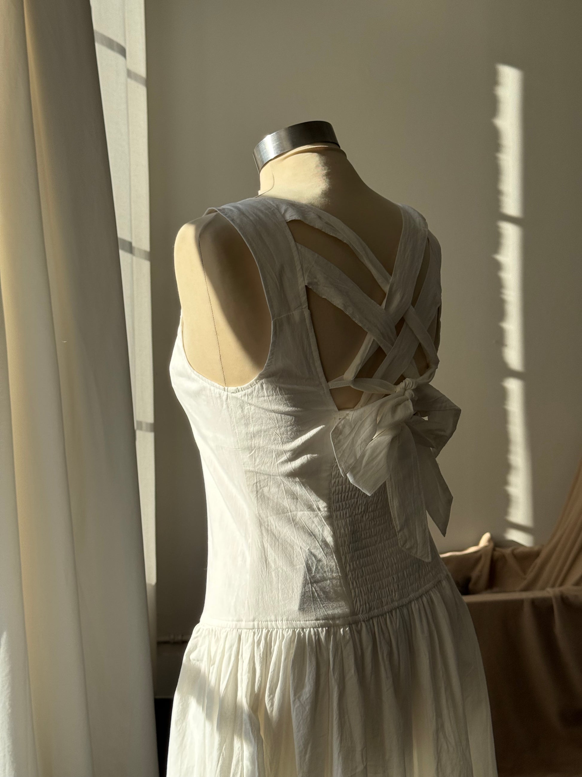 Timeless and effortlessly feminine, this mid-length cotton dress features a flattering drop-waist silhouette that nods to vintage charm. The delicate shoulder straps lace up at the open back for an adjustable, romantic touch, while hidden side pockets bring a hint of practicality to its graceful design. Crafted from soft, breathable cotton, it’s the perfect balance of comfort and classic beauty—ideal for sunlit days, special gatherings, or simple afternoons in the South.