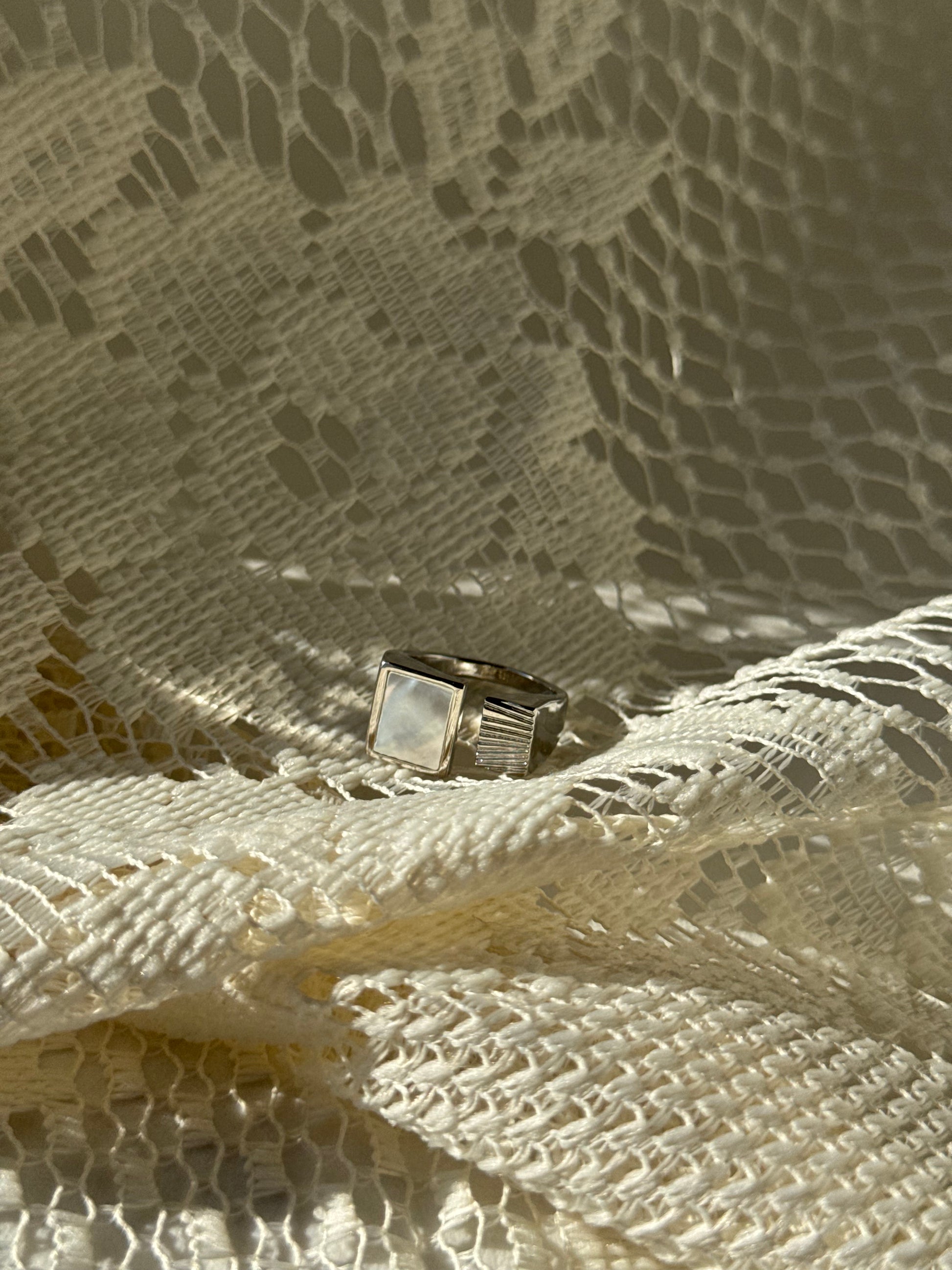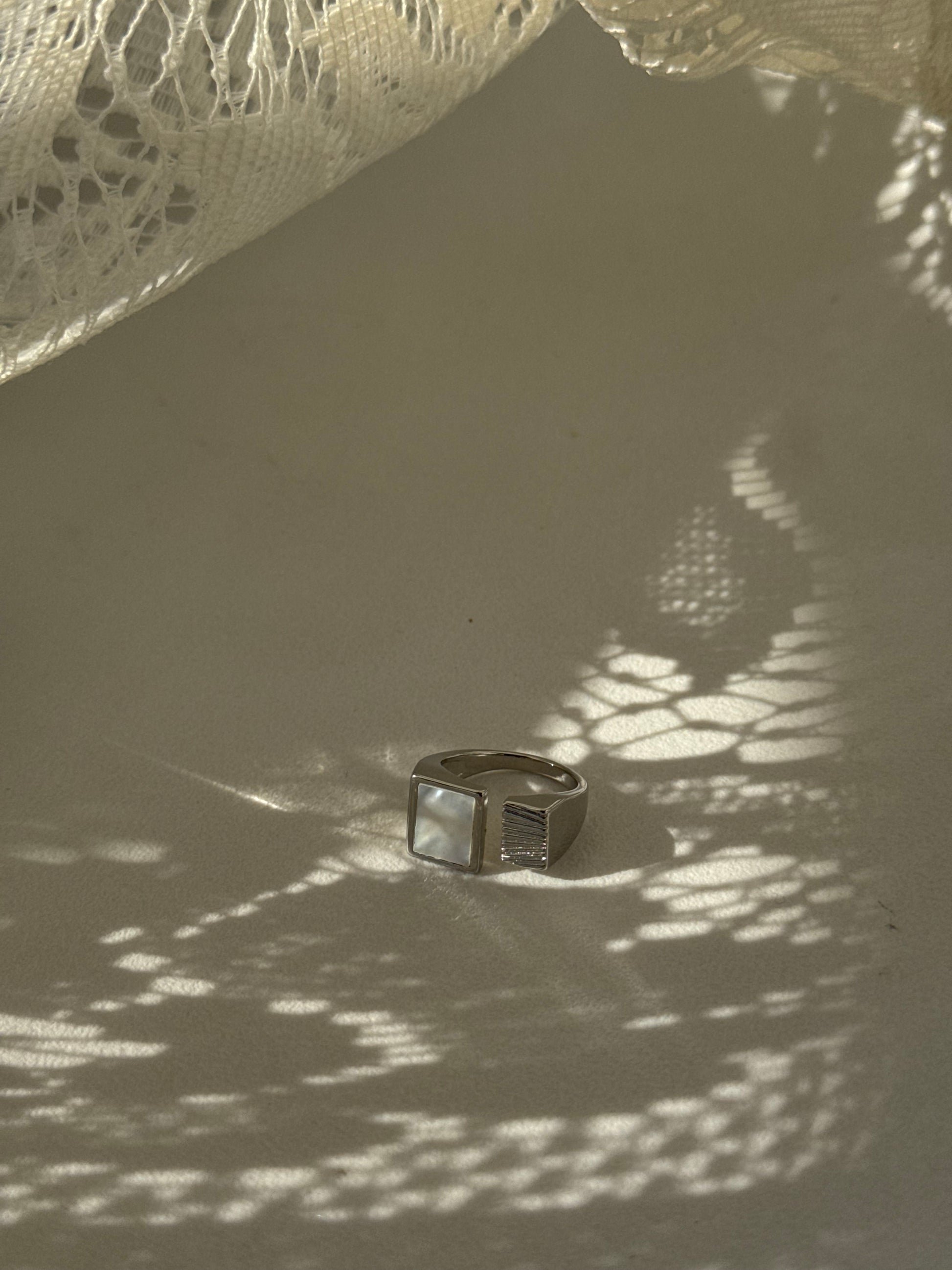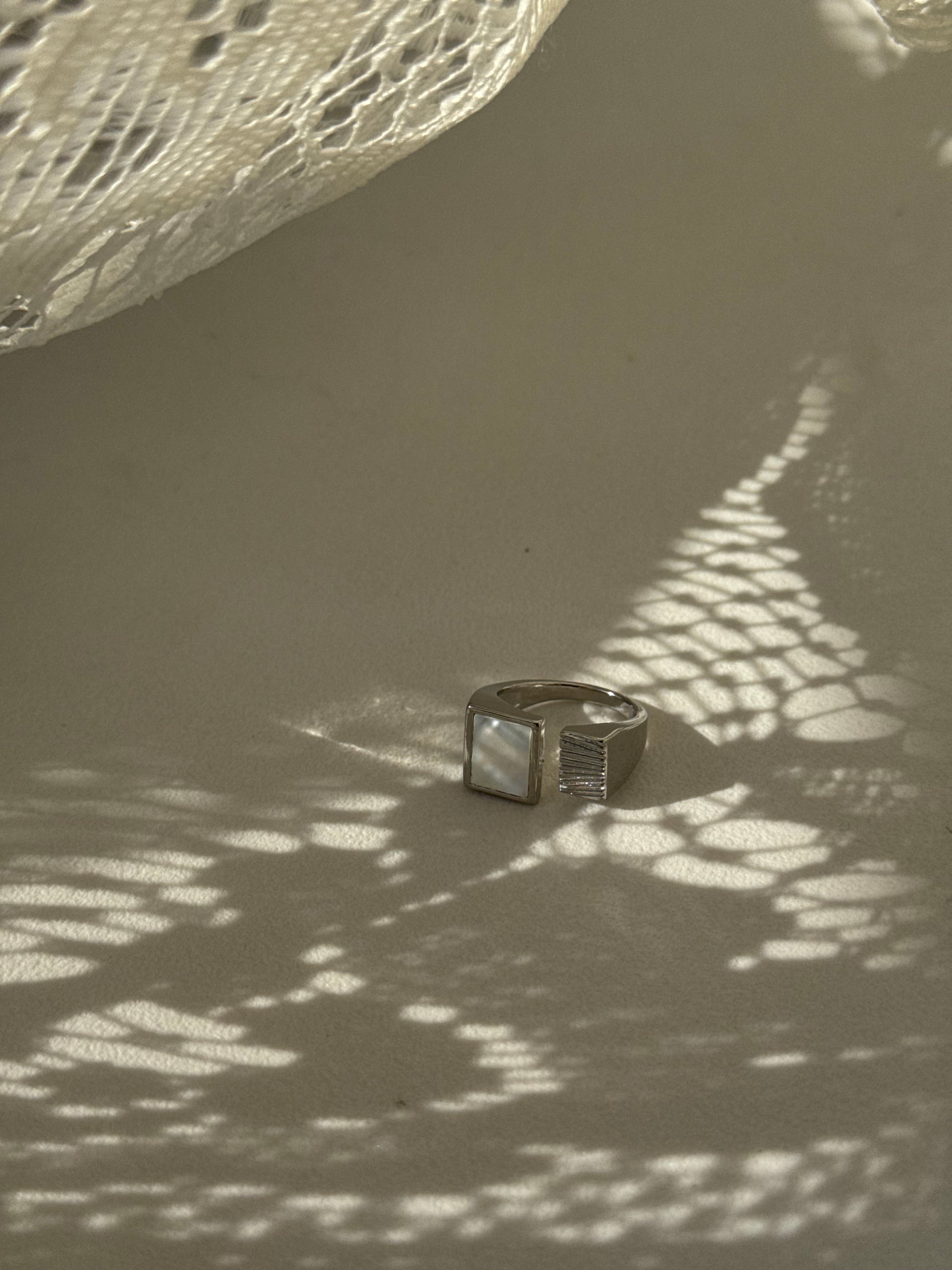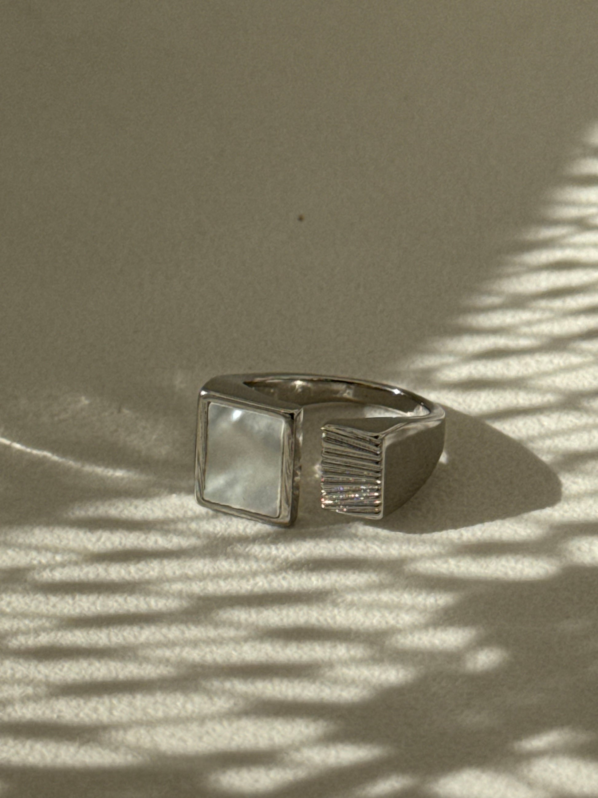 At its center, a polished mother-of-pearl inlay catches the light with soft iridescence, giving each piece a one-of-a-kind glow. The cuff design offers an adjustable fit, while the smooth curves make it comfortable for all-day wear. Whether worn solo as a striking statement or stacked with delicate bands, this ring brings a touch of refined elegance to any look.