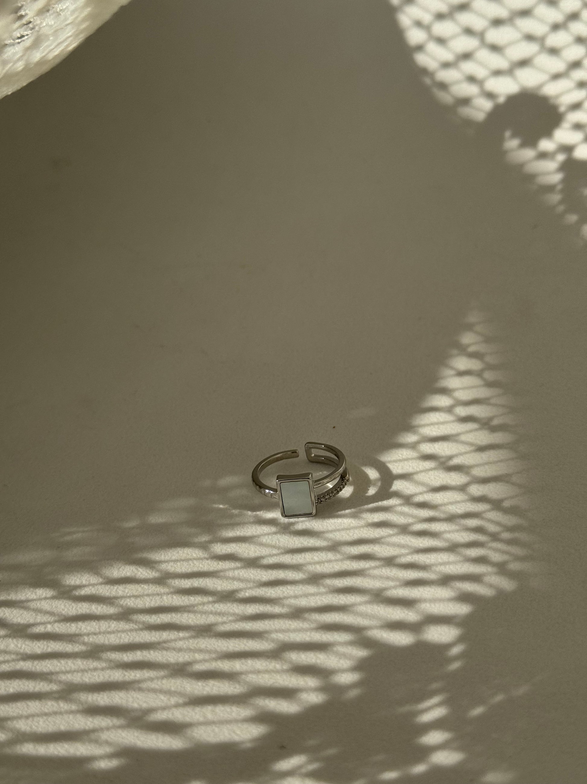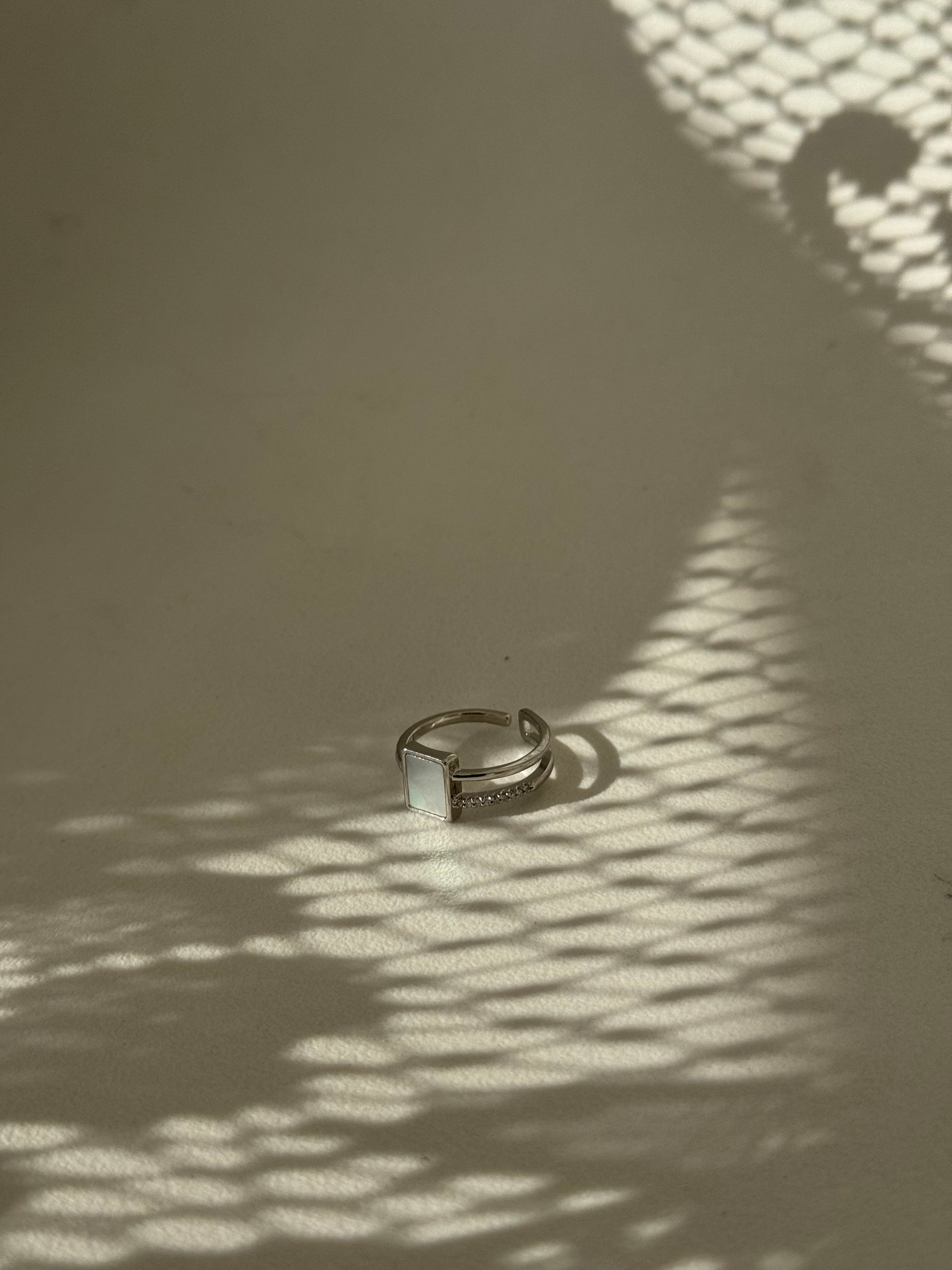 A timeless piece with modern edge, this statement ring showcases the luminous beauty of mother of pearl set in a sleek, open double-band design. The iridescent stone catches the light with every movement, shifting from soft ivory to pearly rainbow tones, making it a versatile accent for day or night. The double band creates a bold yet balanced silhouette, offering both comfort and sophistication. Perfect worn solo as a standout piece or layered with delicate rings for a curated look.
