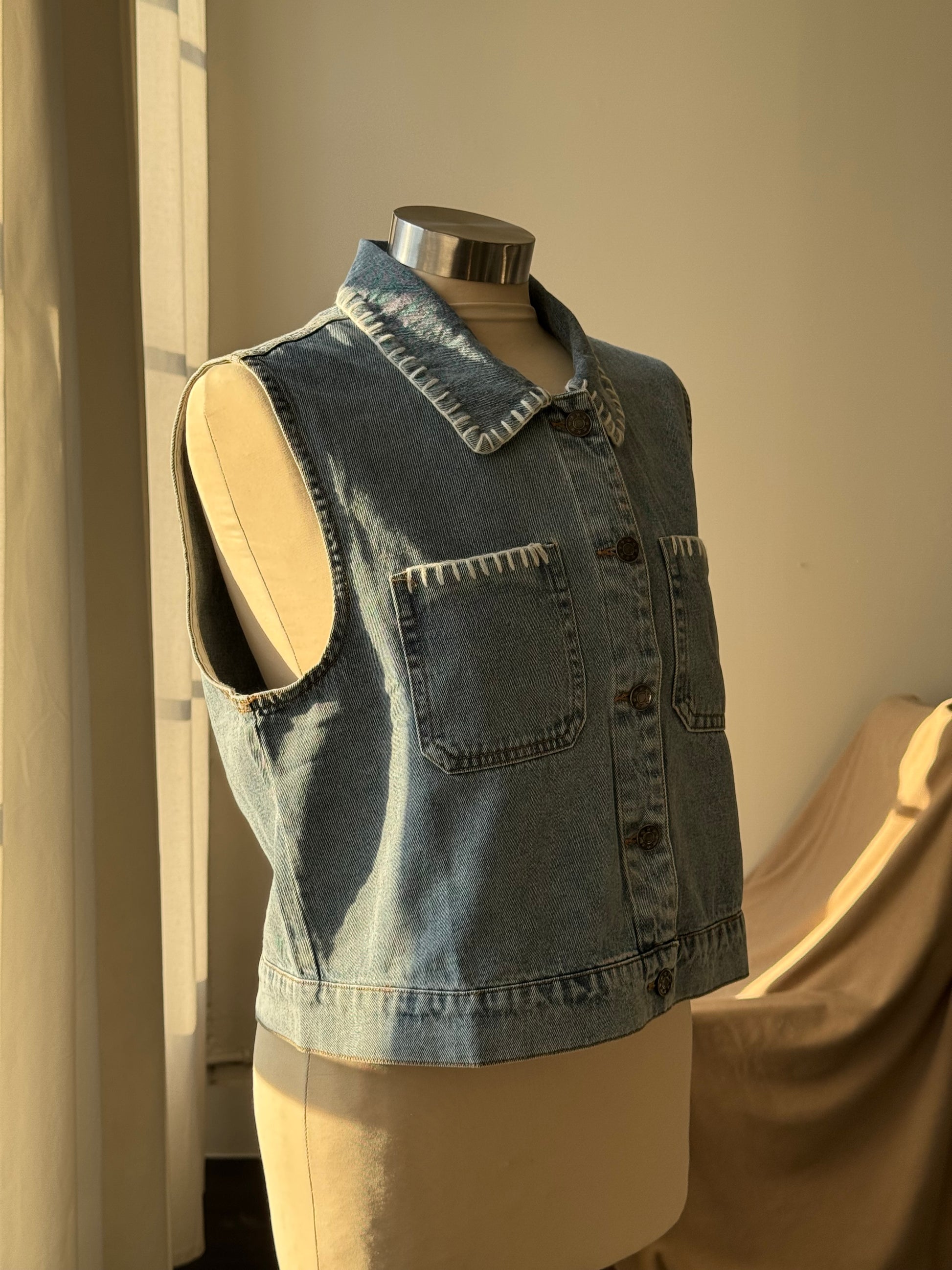 A timeless layering piece reimagined with artisan detail. This cropped denim vest is finished with a hand-stitched blanket edge, giving it a touch of vintage craftsmanship that feels both rugged and refined. Cut from sturdy denim with a classic wash, the silhouette is cropped for a flattering, versatile fit—perfect over dresses, tees, or button-downs. The blanket stitch adds subtle texture and a hint of western charm while keeping the edges crisp and durable. A future-vintage staple designed to stand the test of time.
