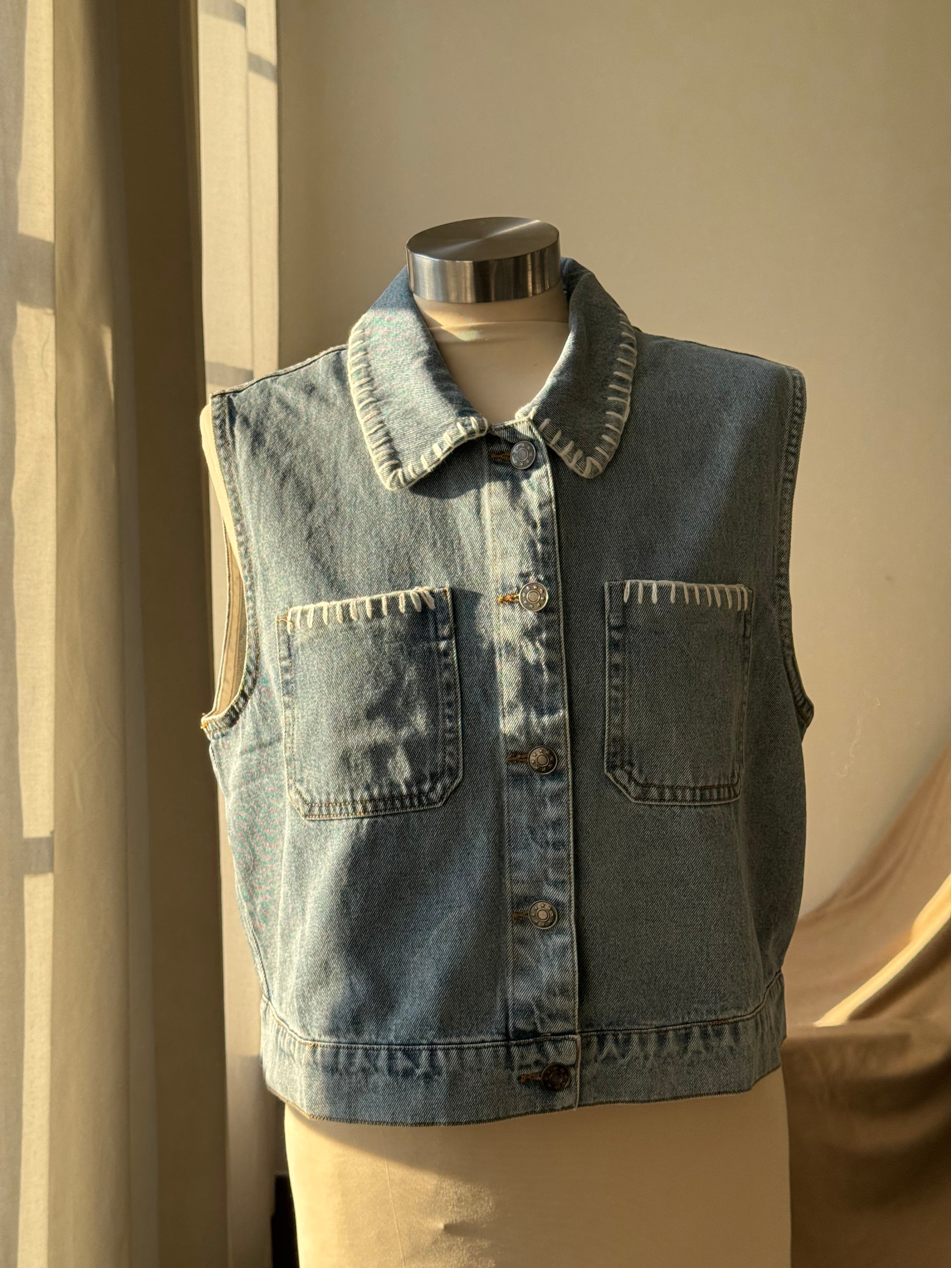 Denise Classic Blanket Stitch Cropped Denim Vest