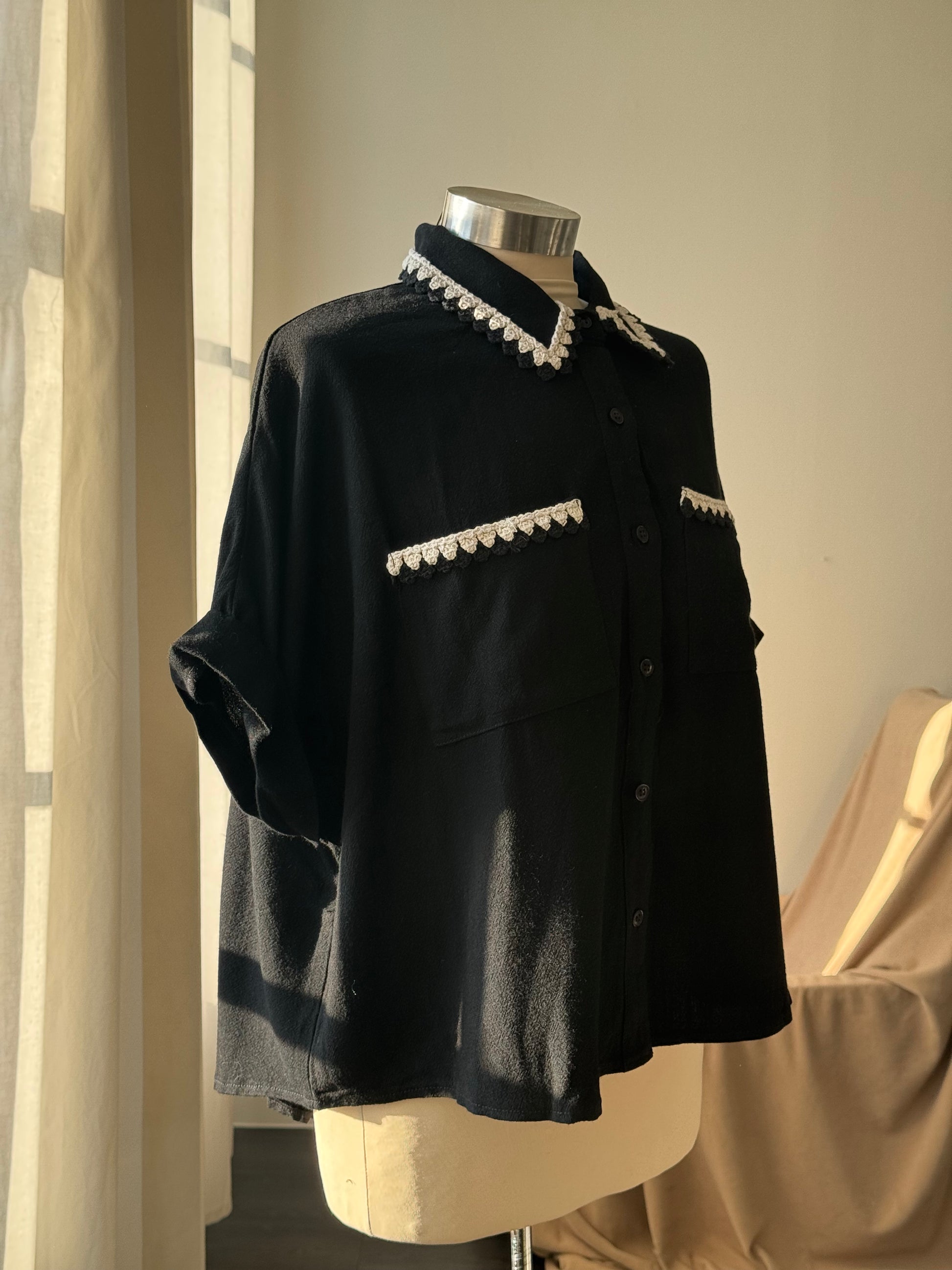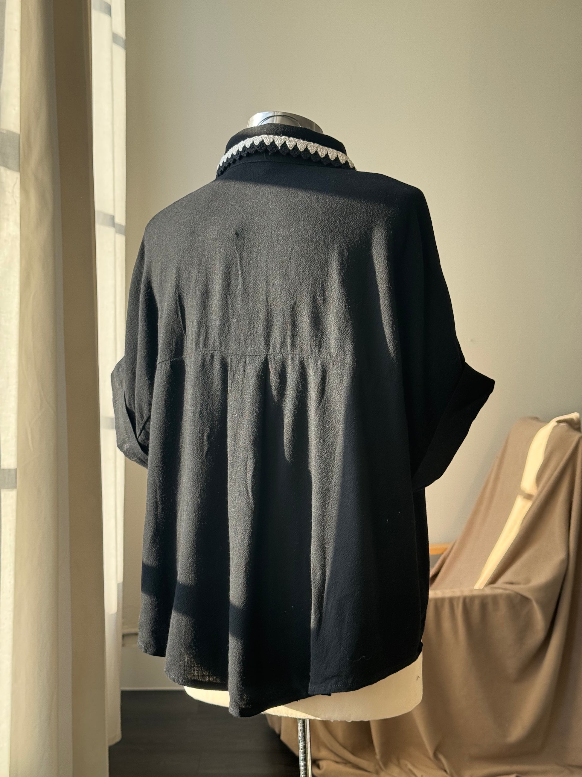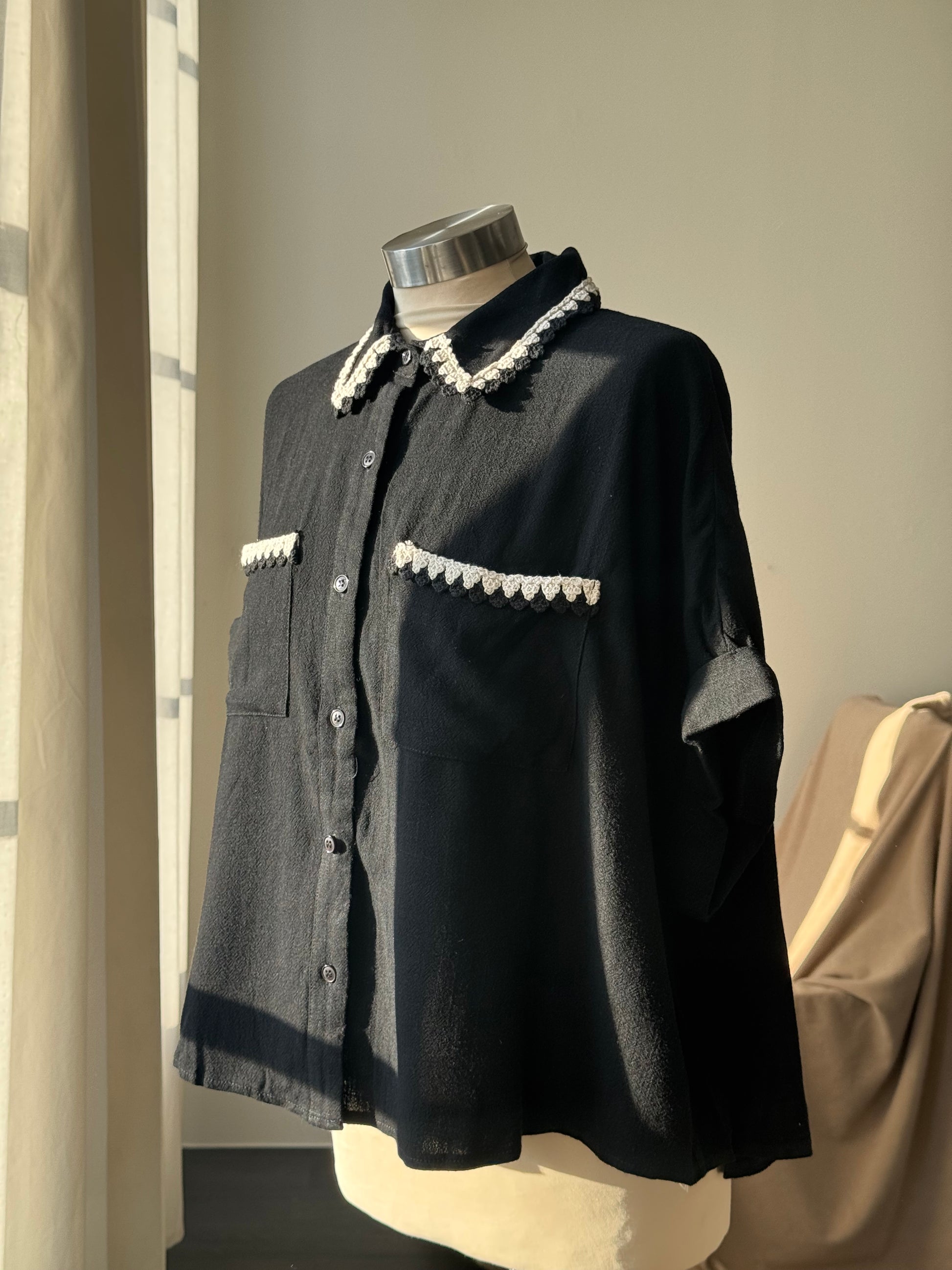 A fresh take on timeless charm, this short sleeve crop top blends breathable linns with intricate hand-crochet details. The button-down front gives it a polished touch, while the standout crochet collar and matching crochet pockets add a nostalgic, handcrafted feel. Designed with a cropped silhouette, it pairs effortlessly with high-waisted jeans, skirts, or layered over dresses.