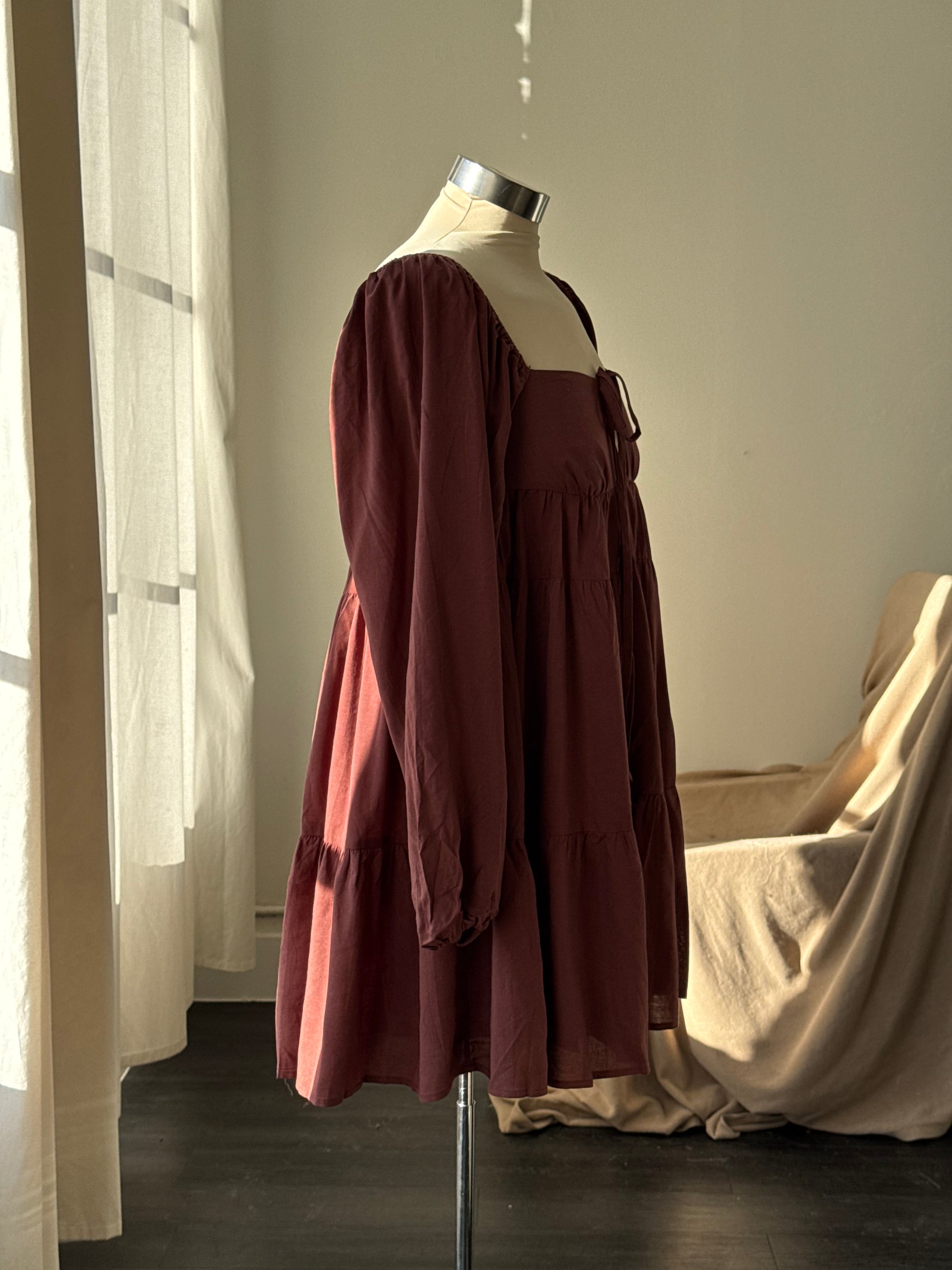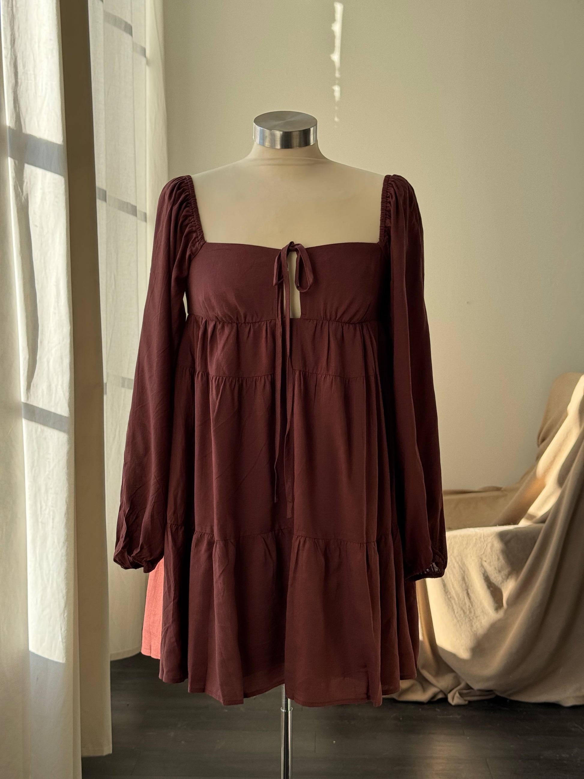 Fluorine Linen Balloon Sleeve Tie Front Dress In Chocolate Brown