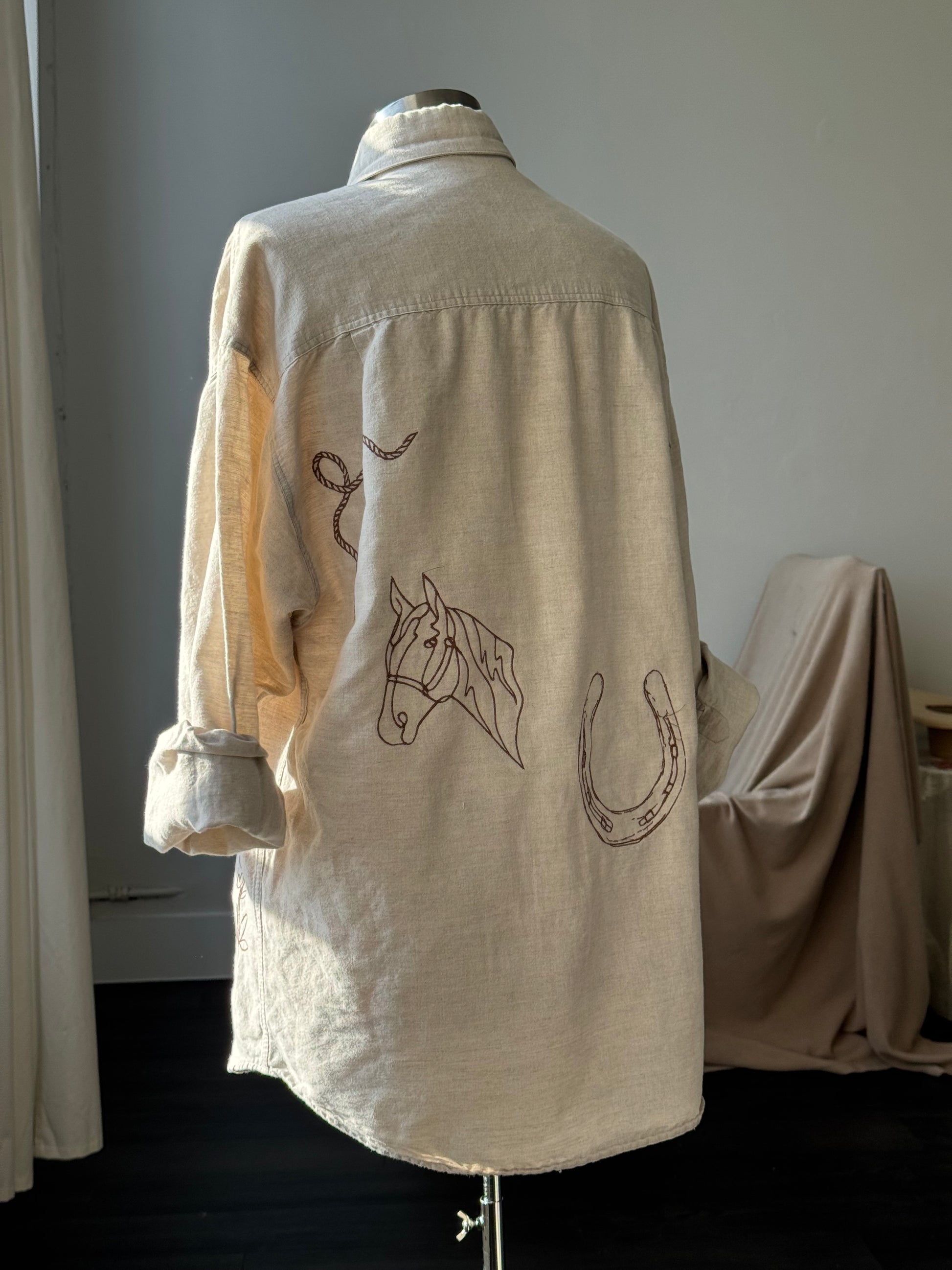 This button down showcases stitching that adds texture and character to the classic silhouette. Made from a cotton and linen blend, it ensures all-day comfort, while the button-front design makes it easy to wear on its own or layered. The embroidery provides subtle detail, celebrating craftsmanship and slow fashion at its finest. Designed for both comfort and versatility, it transitions seamlessly from casual daytime wear to more refined evenings.