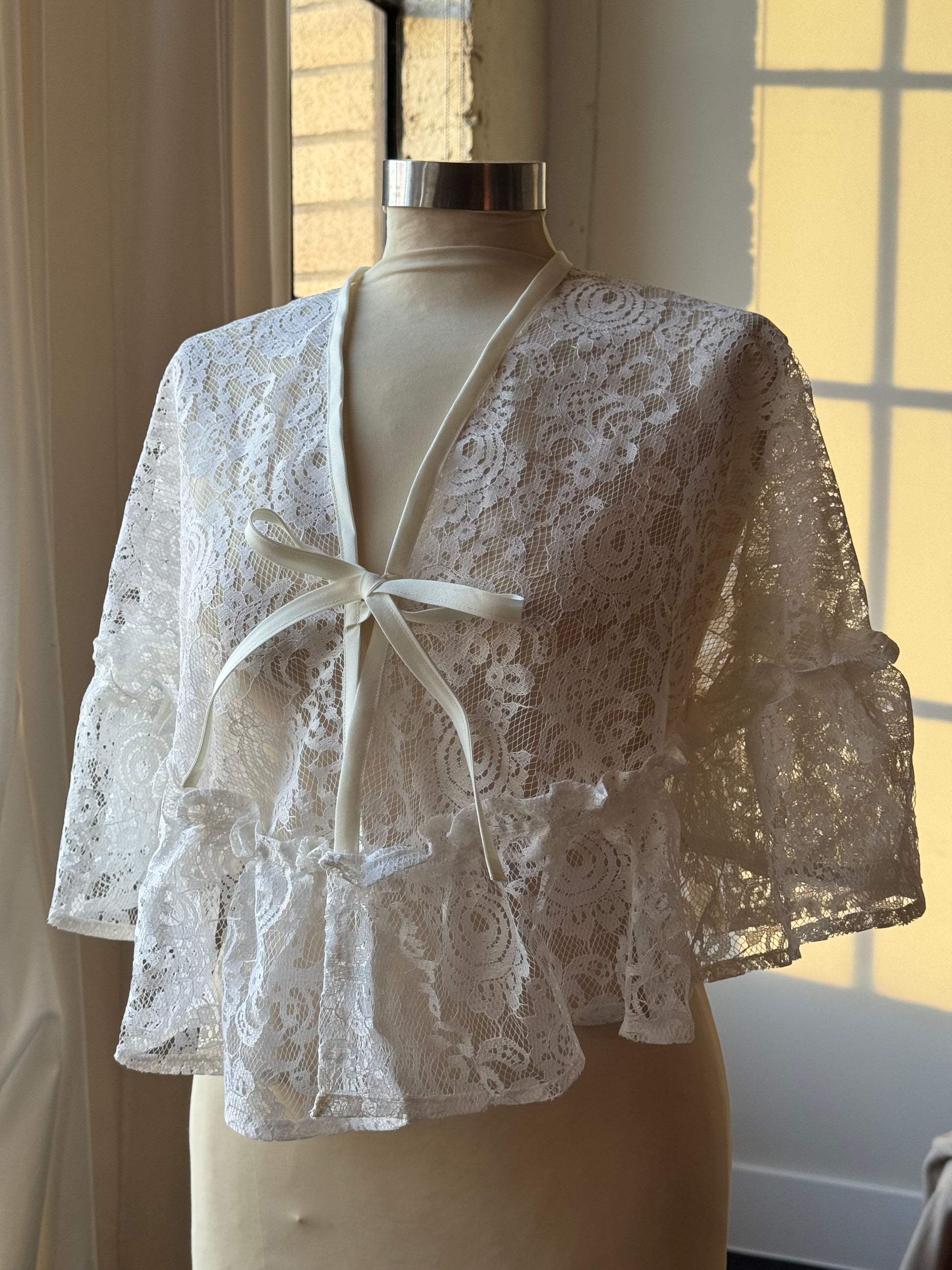 A timeless piece that blends delicate craftsmanship with vintage charm. This handcrafted cape is made from vintage lace and finished with a soft ruffle trim for a touch of romantic movement. The neckline is neatly finished with a bias binding for structure and durability, while the tie-front closure allows for an adjustable, graceful drape. Perfect layered over bridal dresses, casual dresses or blouses, jackets, & coats this piece adds a hint of old-world elegance to any modern wardrobe.