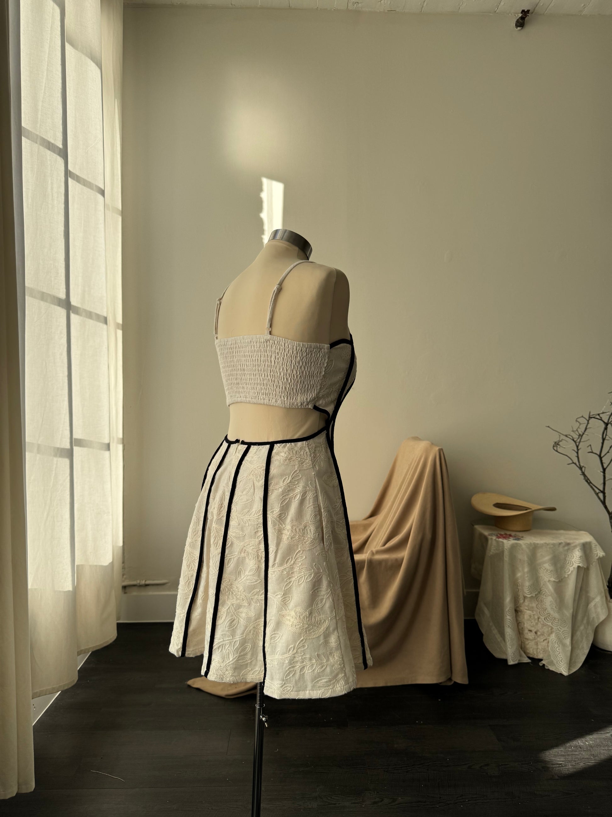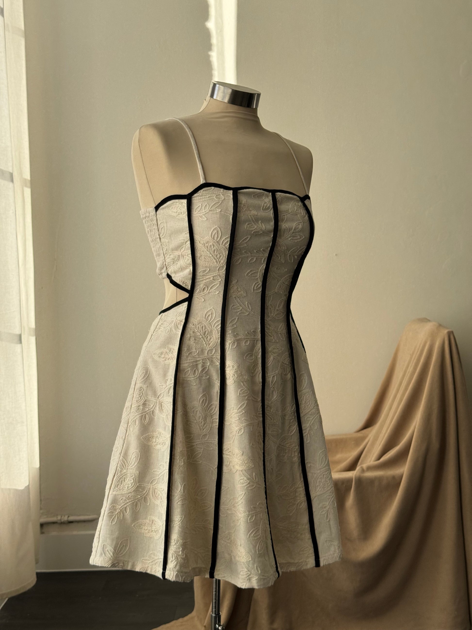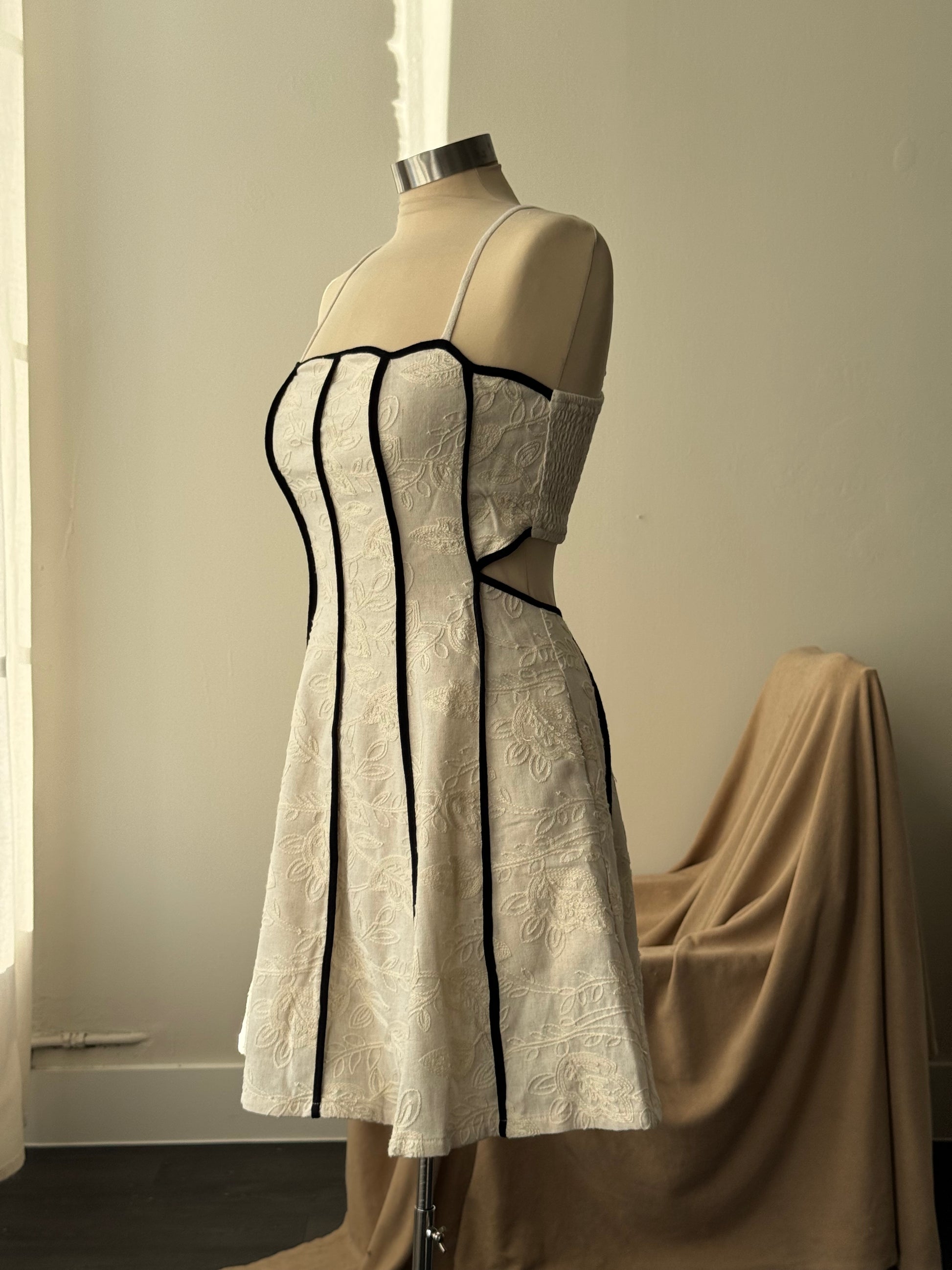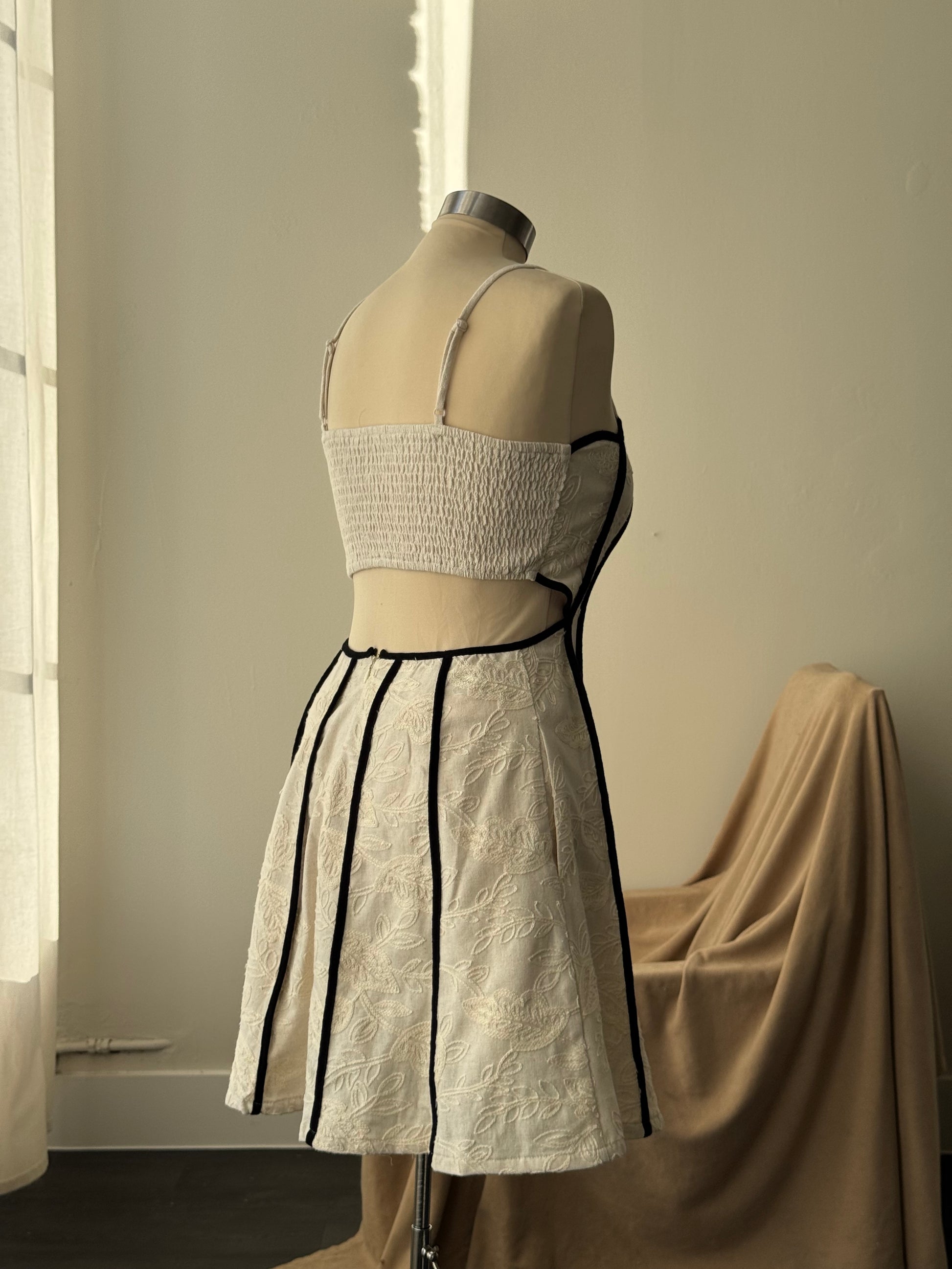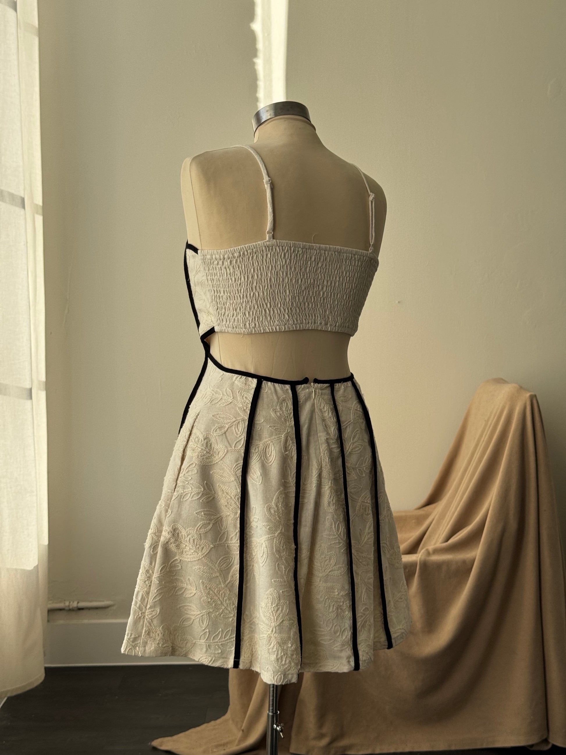 A charming statement piece designed for celebration. This mini party dress features delicate embroidered piping that frames a scalloped neckline, adding a touch of vintage-inspired romance. The open-back silhouette creates an effortless wow factor, while a fully lined interior ensures comfort and confidence from day to night. Finished with hidden side pockets for a practical, thoughtful touch, this dress blends beauty and wearability seamlessly.