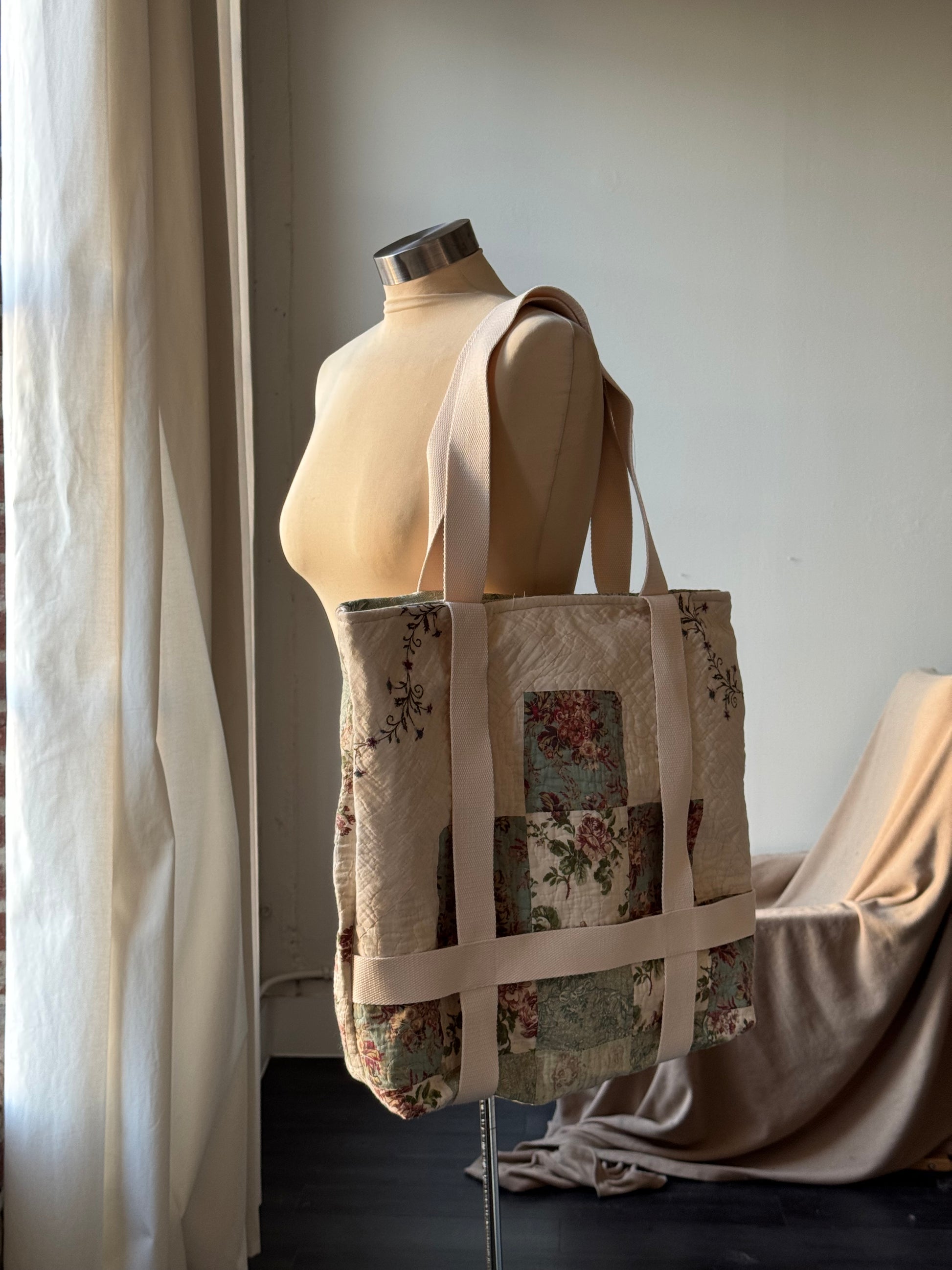 Carryall tote bag made from a repurposed quilt and a vintage lining. Boxy silhouette that's opened at the top with a recessed zipper closure, two interior utility pockets and finished with an outer hat holder to store your hat wear during long walks, car rides, or tripes to the airport.