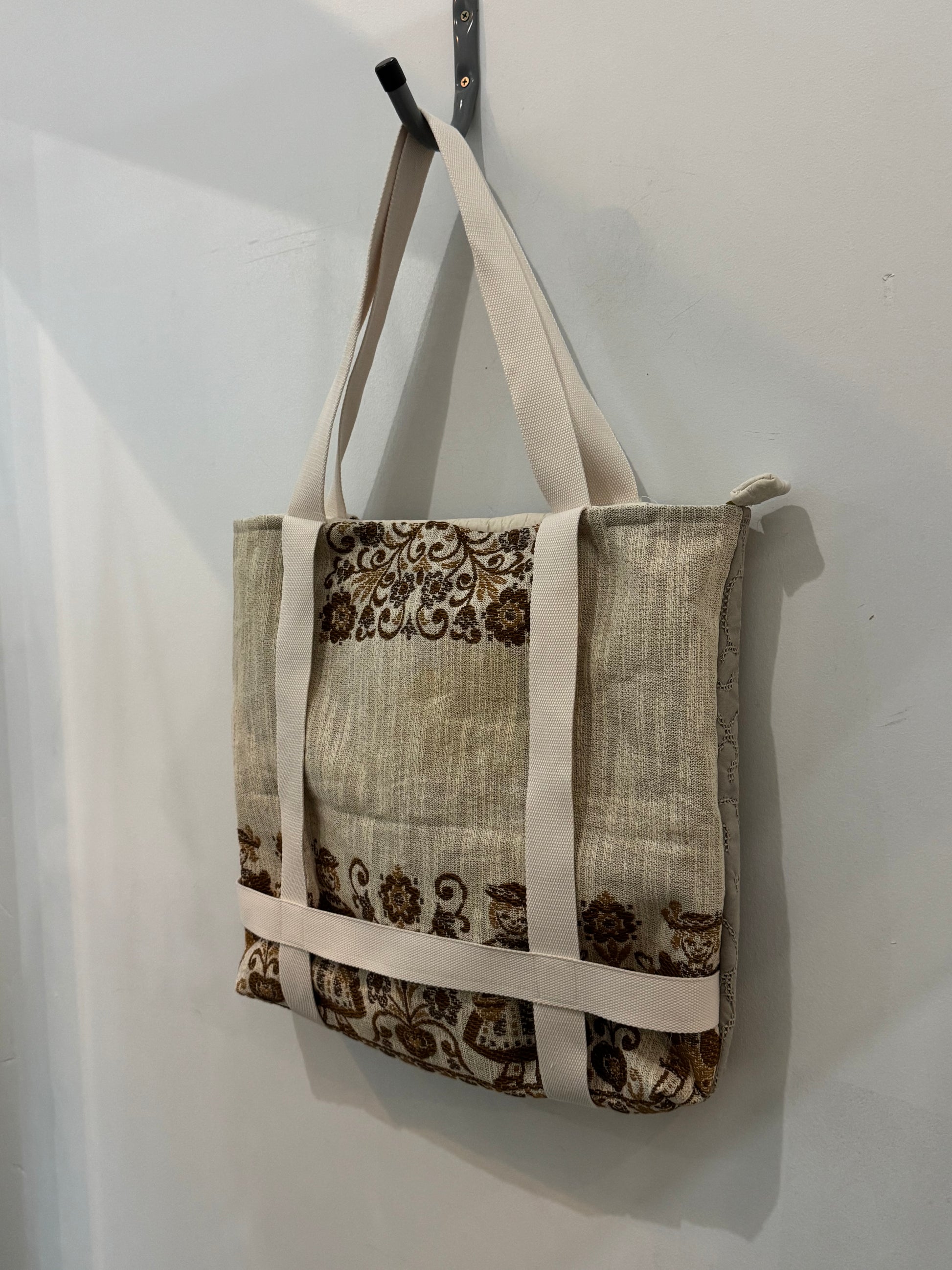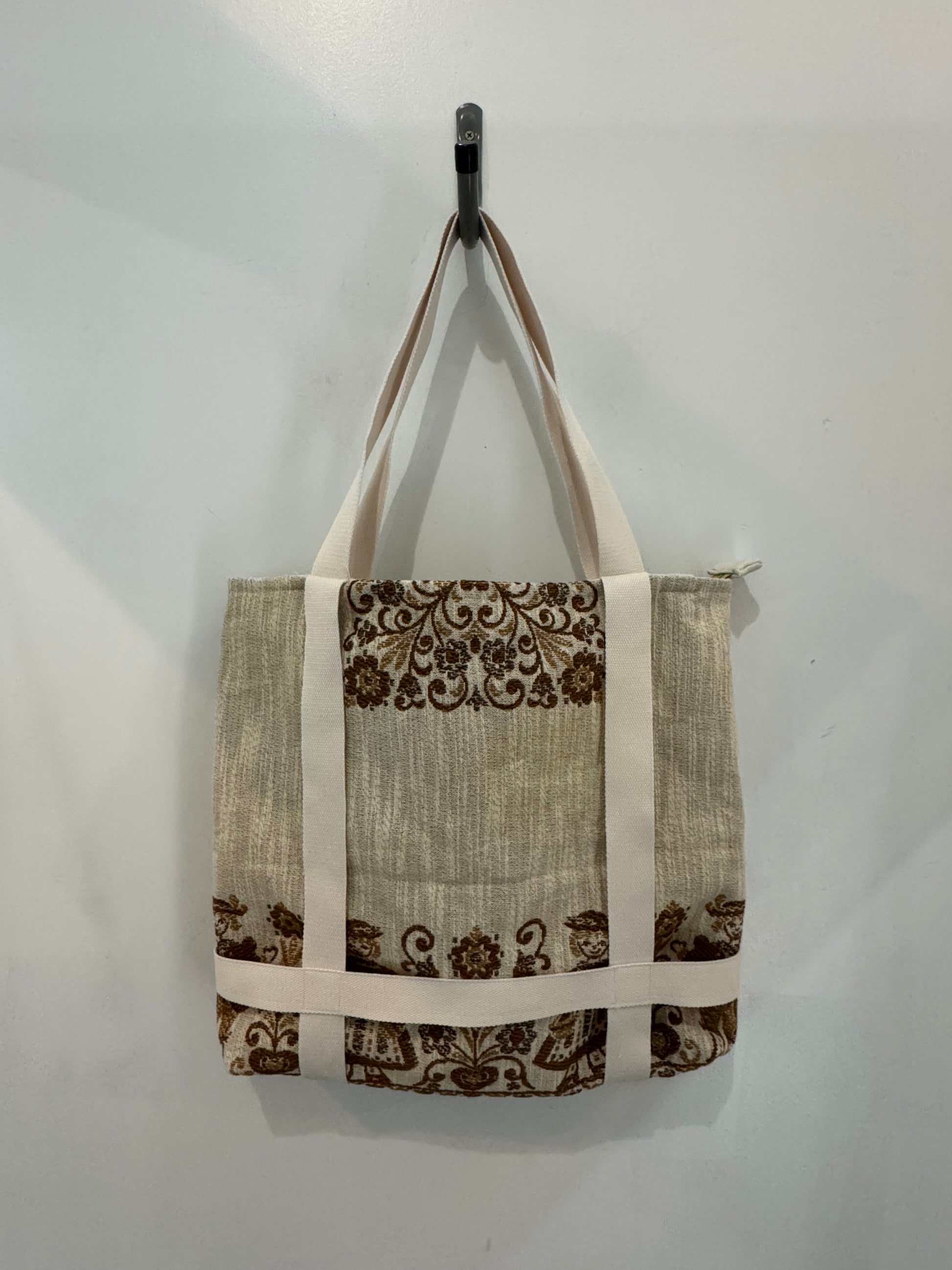 Carryall tote bag made from a repurposed vintage table cloth and a vintage lining. Boxy silhouette that's opened at the top with a recessed zipper closure, two interior utility pockets and finished with an outer hat holder to store your hat wear during long walks, car rides, or tripes to the airport.