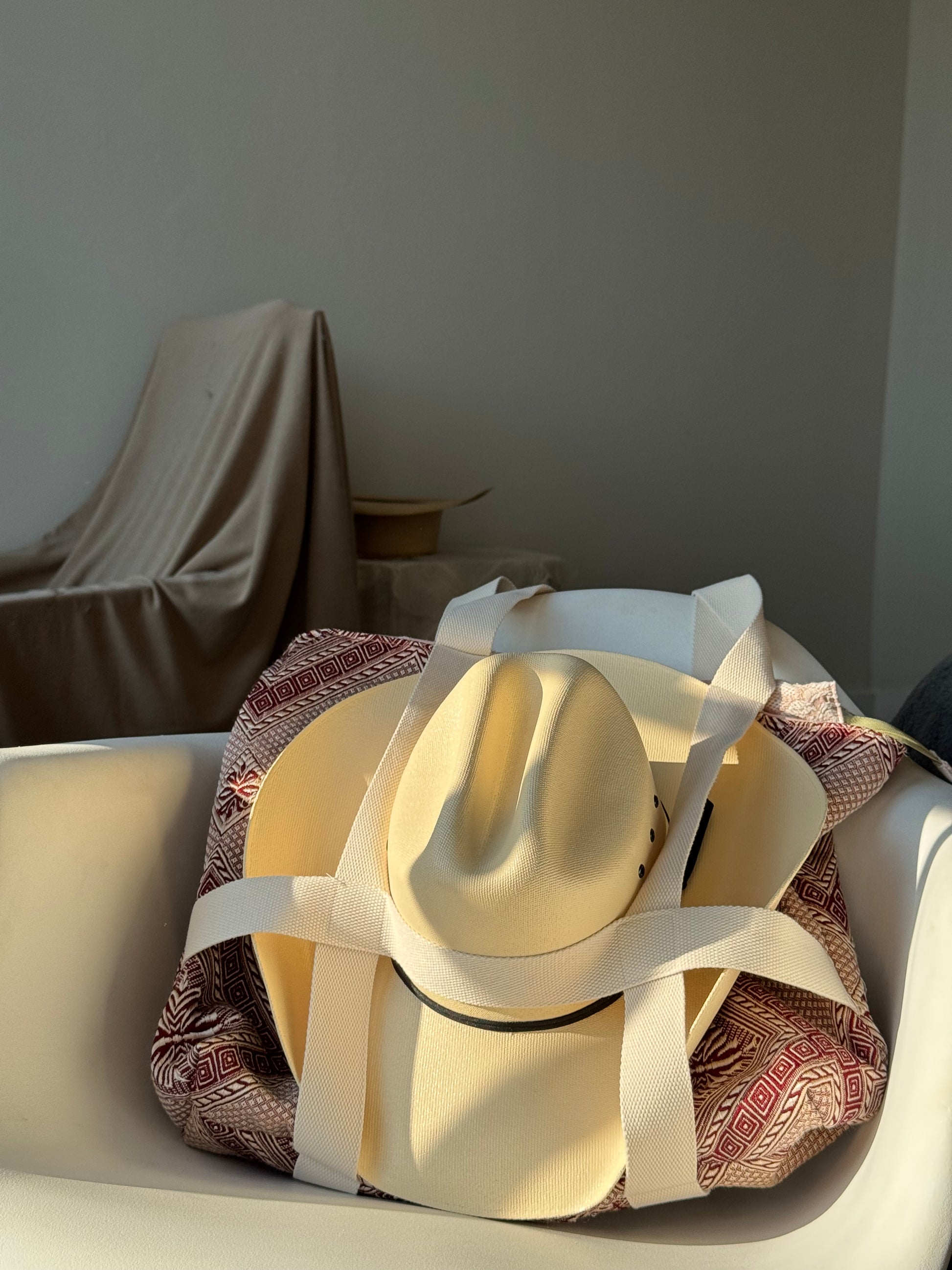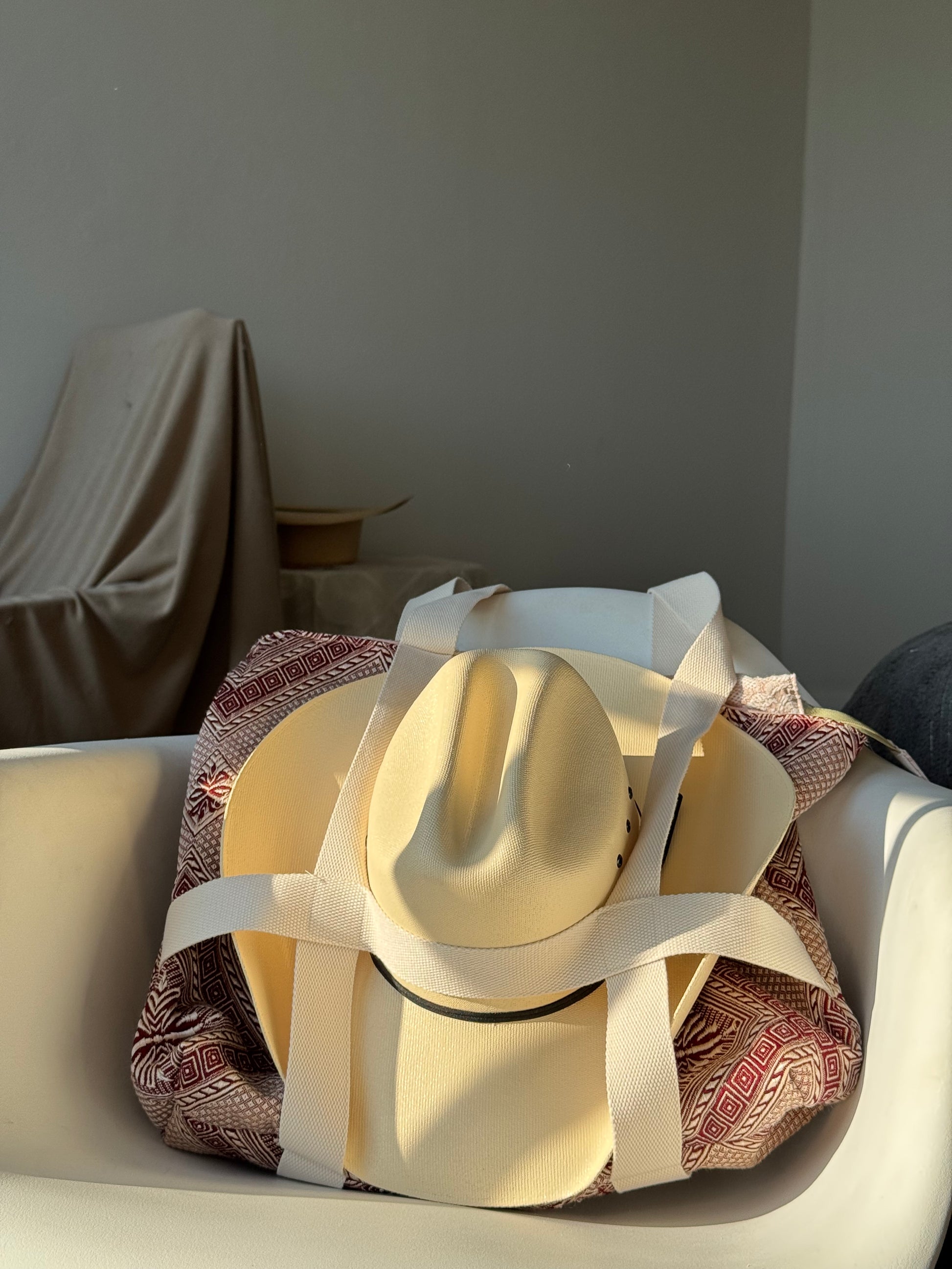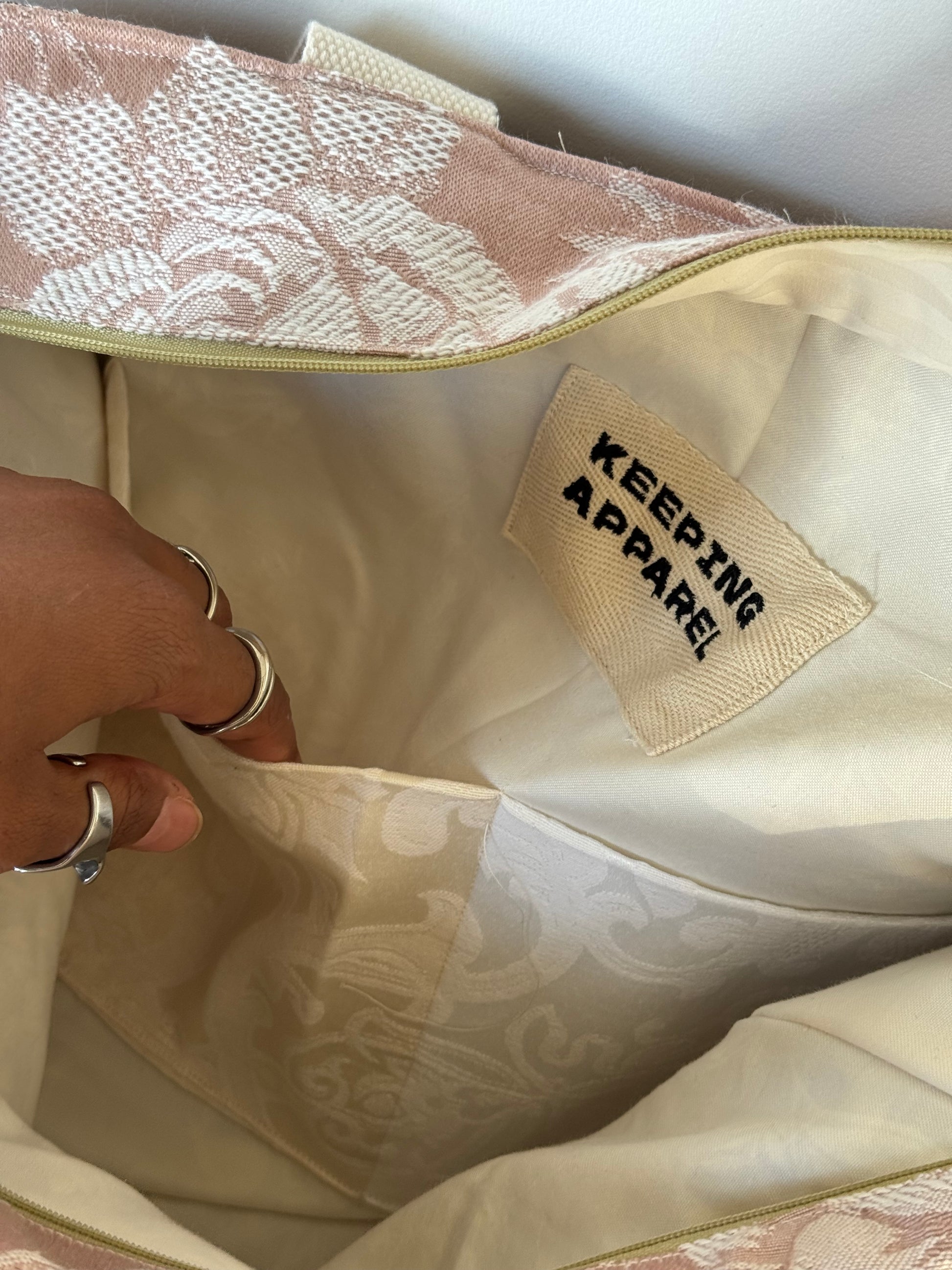 Carryall tote bag made from repurposed materials and a vintage lining. Boxy silhouette that's opened at the top with a recessed zipper closure, two interior utility pockets and finished with an outer hat holder to store your hat wear during long walks, car rides, or tripes to the airport.