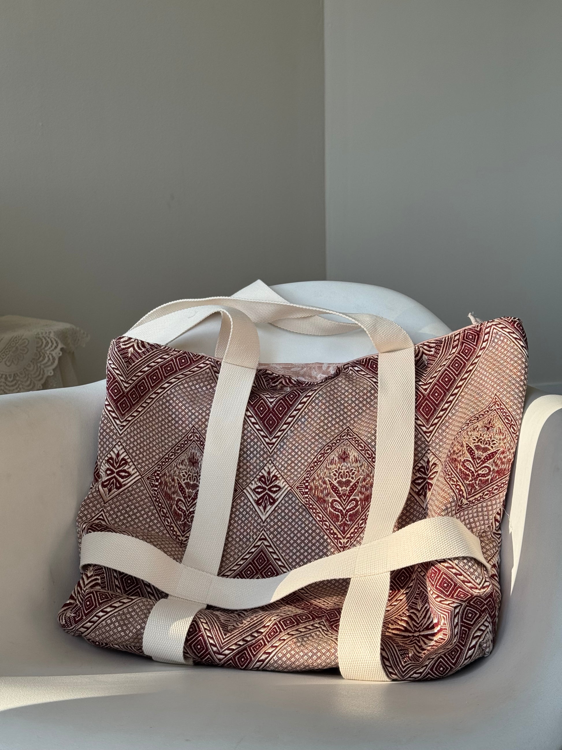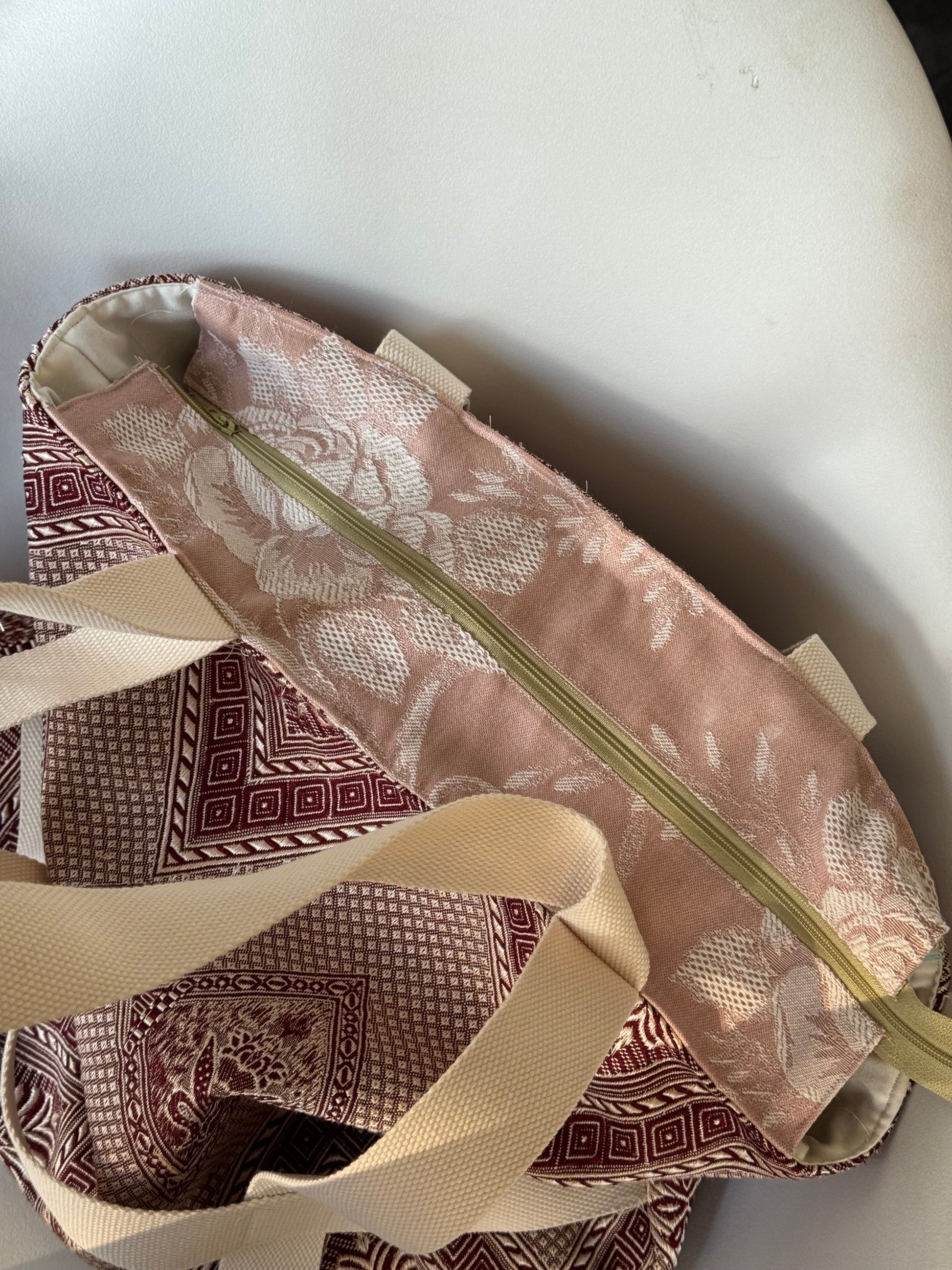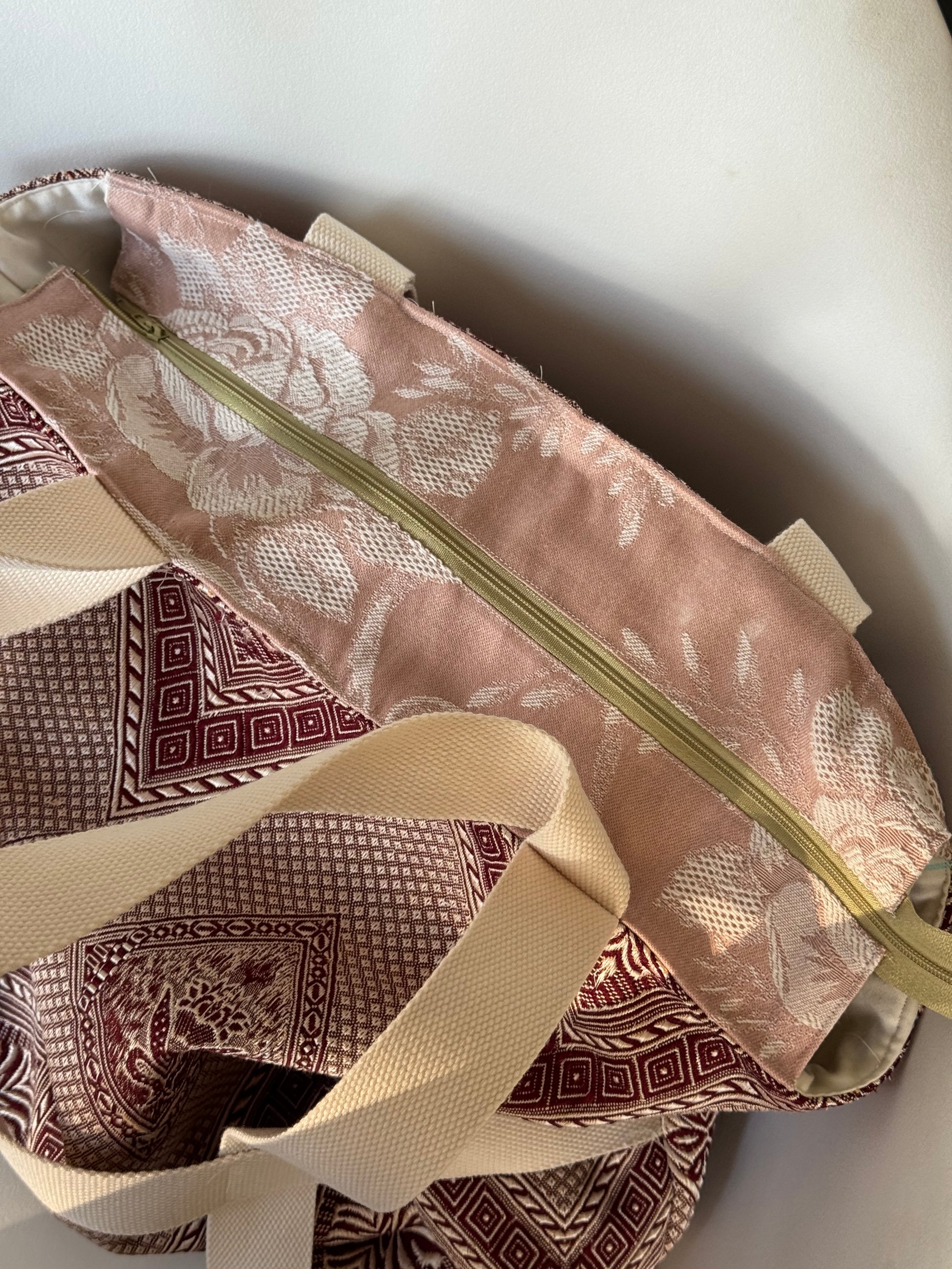 Carryall tote bag made from repurposed materials and a vintage lining. Boxy silhouette that's opened at the top with a recessed zipper closure, two interior utility pockets and finished with an outer hat holder to store your hat wear during long walks, car rides, or tripes to the airport.