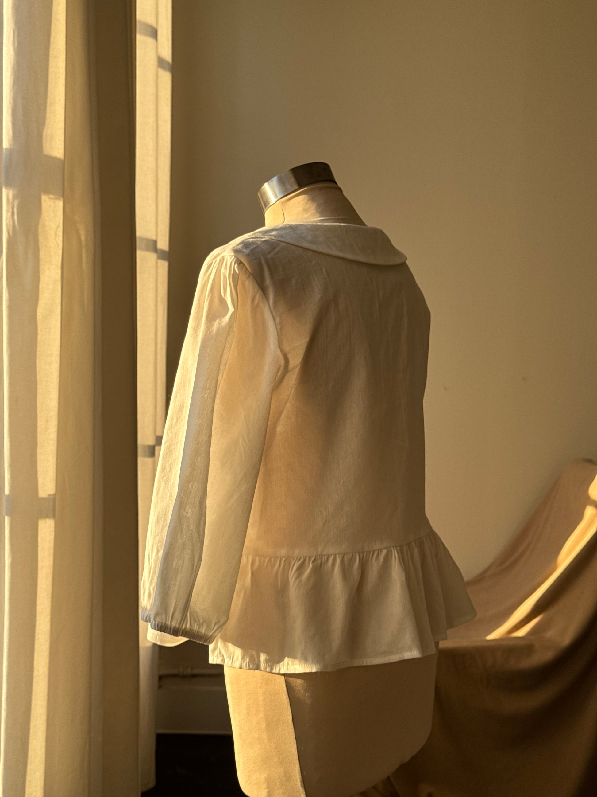 A playful twist on vintage charm, this cotton crop top is designed with a delicate Peter Pan collar and airy, three-quarter sleeves. Slightly sheer for a romantic touch, it ties at the front. Lightweight and breathable, this piece layers beautifully over bralettes or slips, making it a versatile staple for sunny days and effortless evenings.