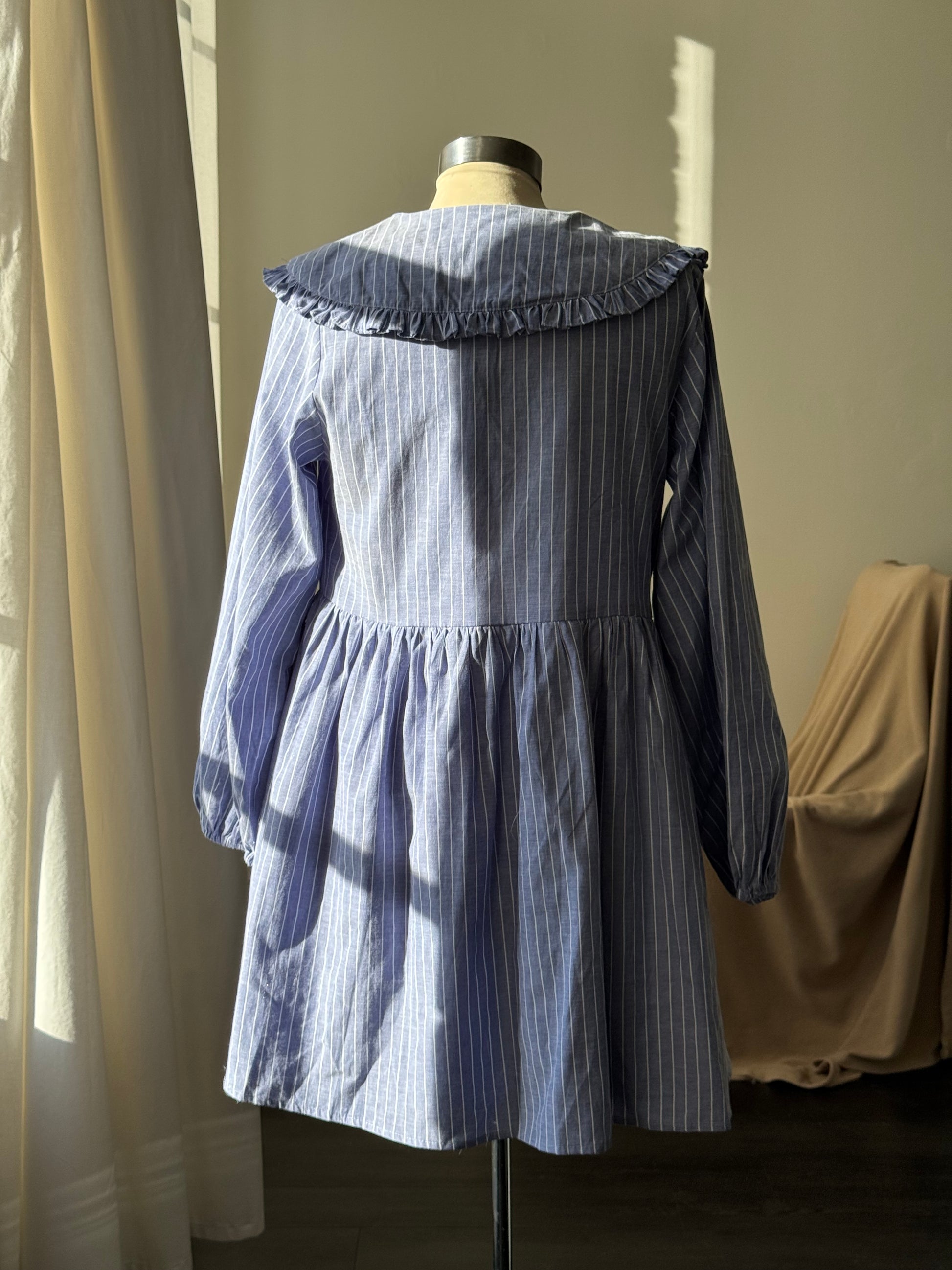 A timeless blend of charm and comfort, this striped cotton dress is designed to flatter in every detail. The ruffled collar frames the neckline with vintage grace, while the adjustable tie-front adds a soft, feminine touch. Billowing balloon sleeves bring romantic volume, balanced by a fully lined silhouette that drapes effortlessly. Hidden side pockets lend a touch of practicality without compromising the flow of the design. Crafted from breathable cotton, it’s the perfect day-to-evening piece for warm days and breezy nights alike.