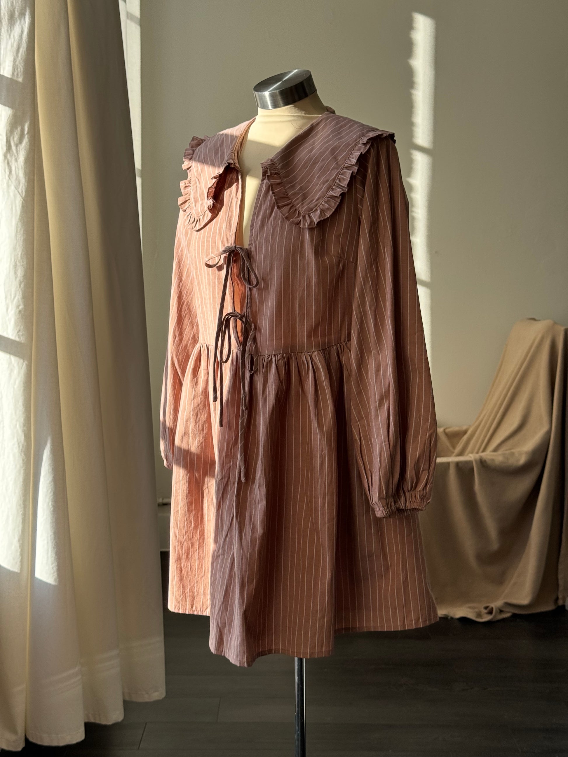A timeless blend of charm and comfort, this striped cotton dress is designed to flatter in every detail. The ruffled collar frames the neckline with vintage grace, while the adjustable tie-front adds a soft, feminine touch. Billowing balloon sleeves bring romantic volume, balanced by a fully lined silhouette that drapes effortlessly. Hidden side pockets lend a touch of practicality without compromising the flow of the design. Crafted from breathable cotton, it’s the perfect day-to-evening piece for warm days and breezy nights alike.