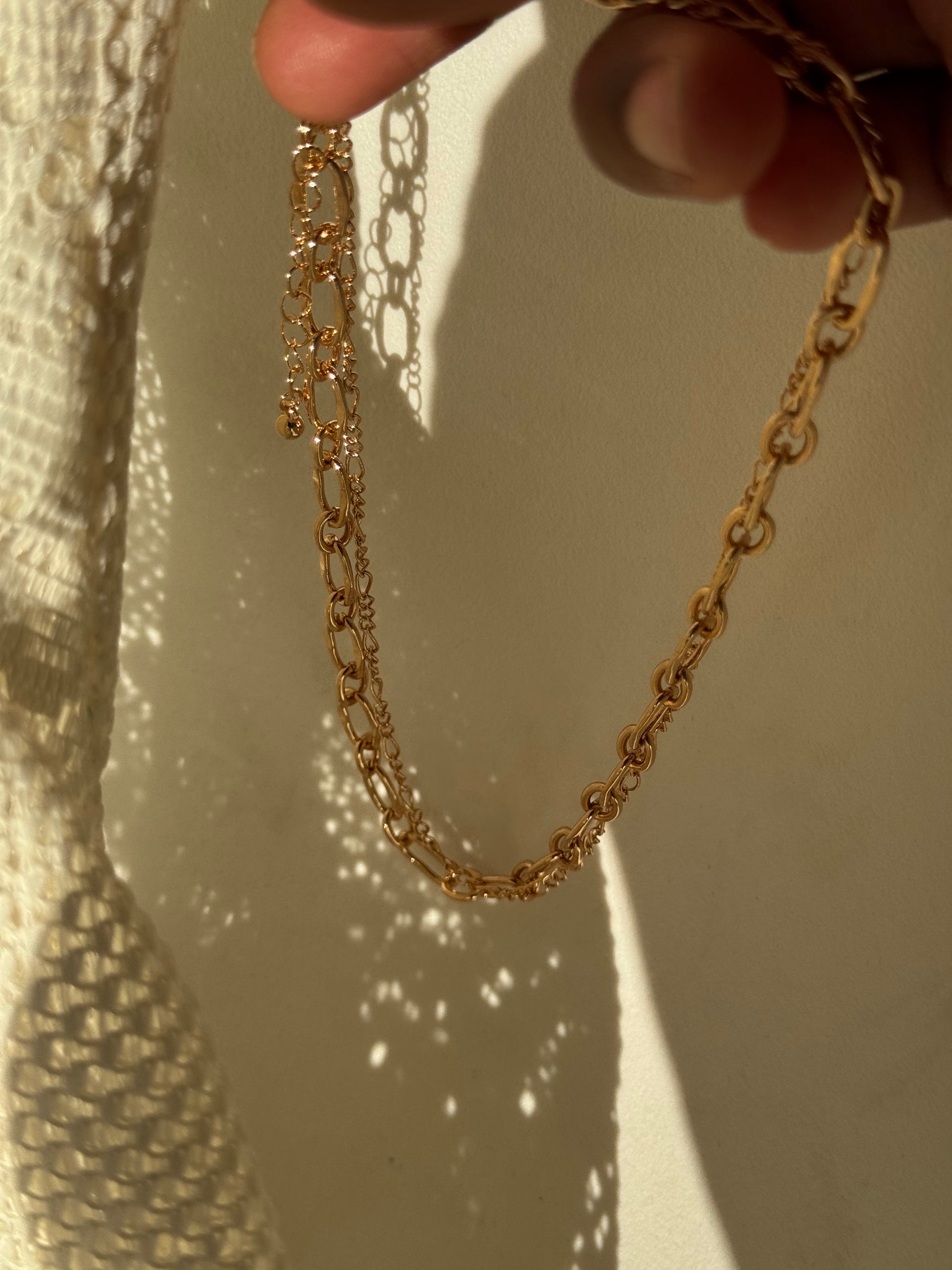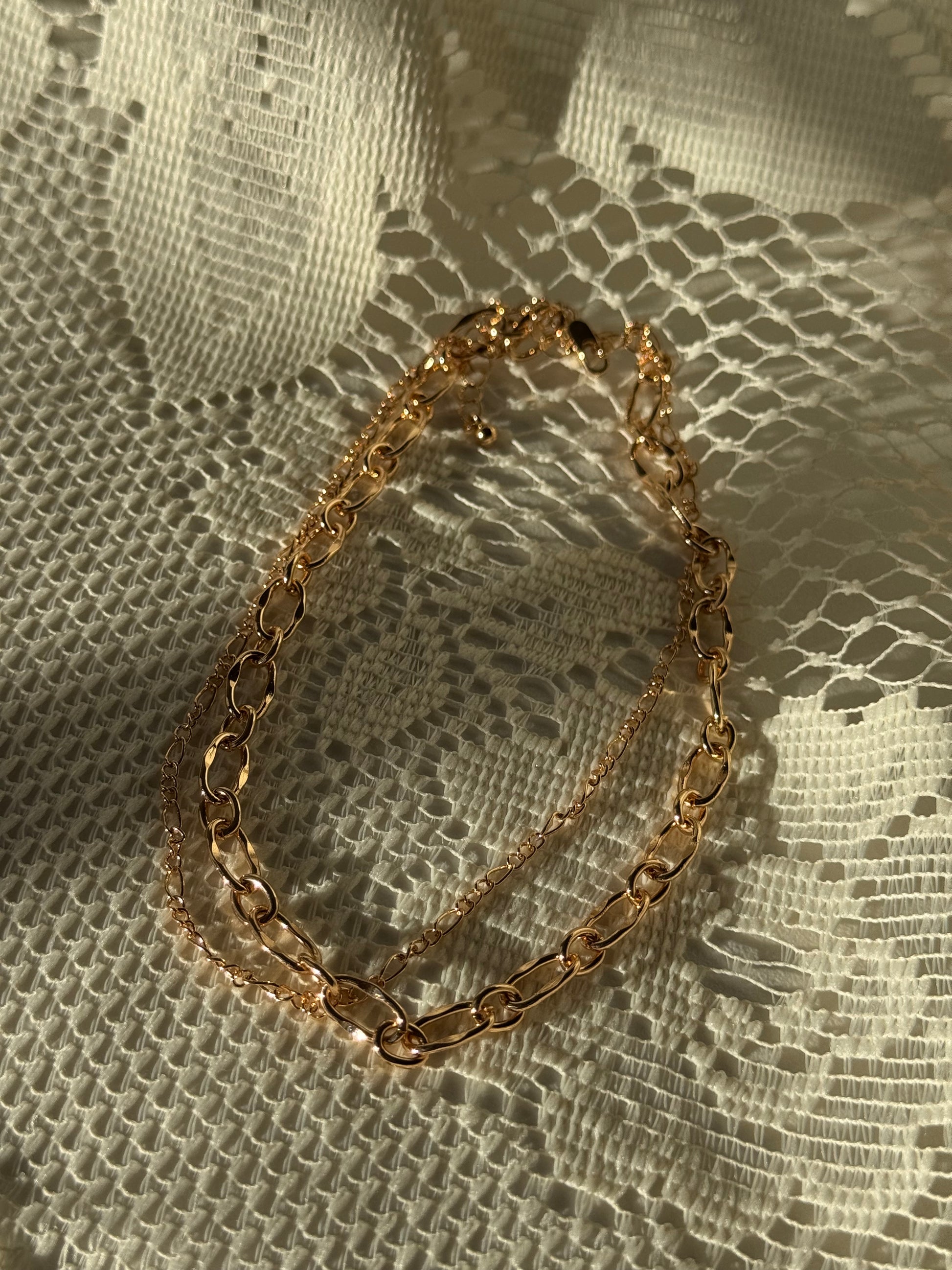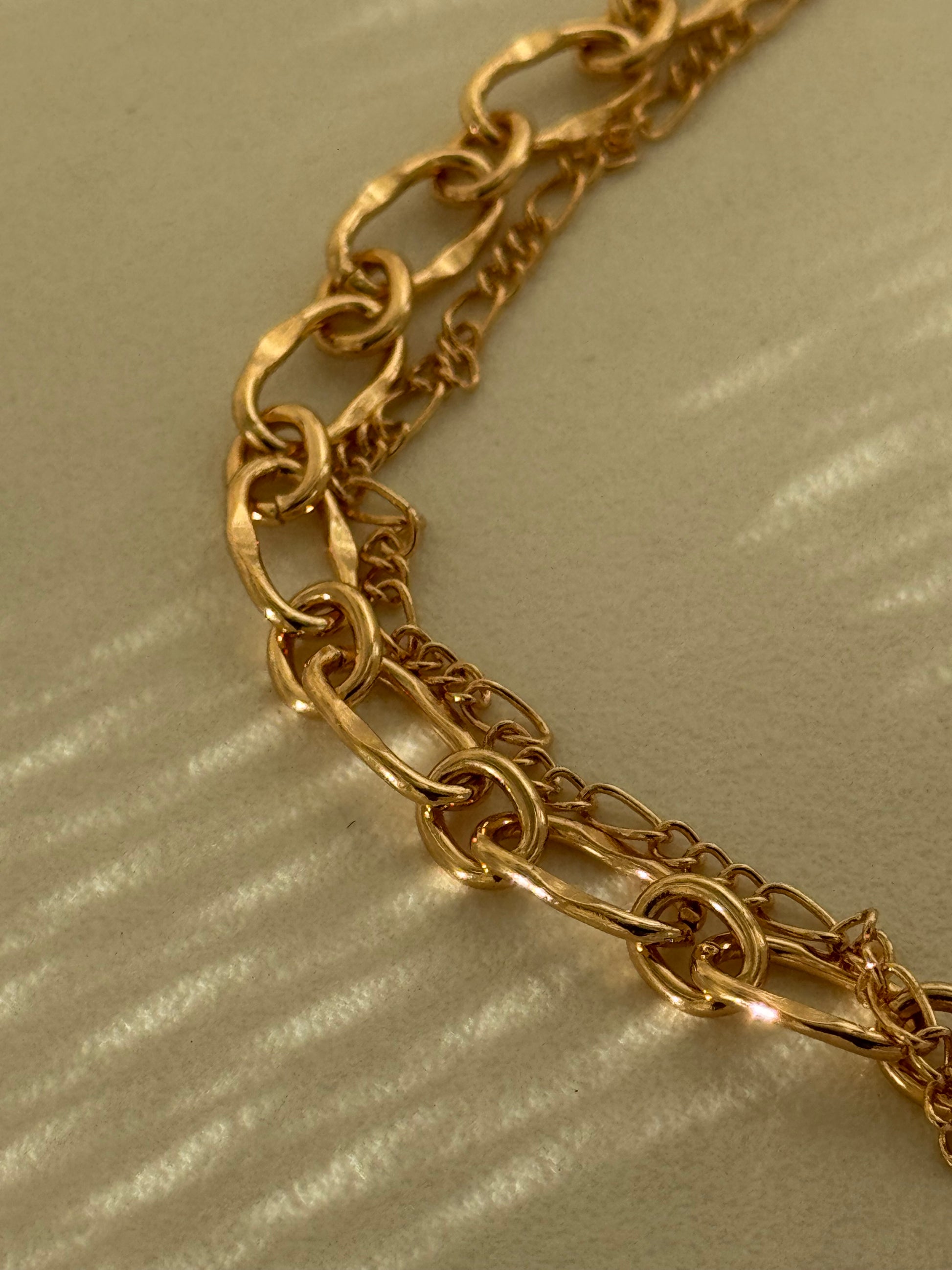 A bold yet timeless piece that instantly elevates any look. This layered chain-link necklace features multiple rows of polished interlocking links, creating the perfect balance of edge and elegance. Designed to sit beautifully along the neckline, each layer drapes effortlessly for a dimensional effect. Ideal for pairing with both casual tees and evening wear, this versatile piece adds a touch of modern sophistication to every outfit.