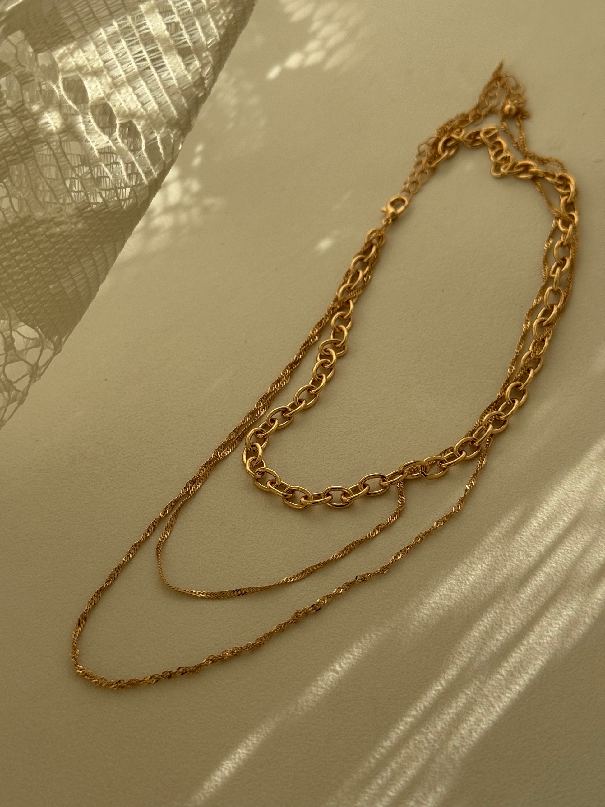 A bold yet timeless piece that instantly elevates any look. This layered chain-link necklace features multiple rows of polished interlocking links, creating the perfect balance of edge and elegance. Designed to sit beautifully along the neckline, each layer drapes effortlessly for a dimensional effect. Ideal for pairing with both casual tees and evening wear, this versatile piece adds a touch of modern sophistication to every outfit.