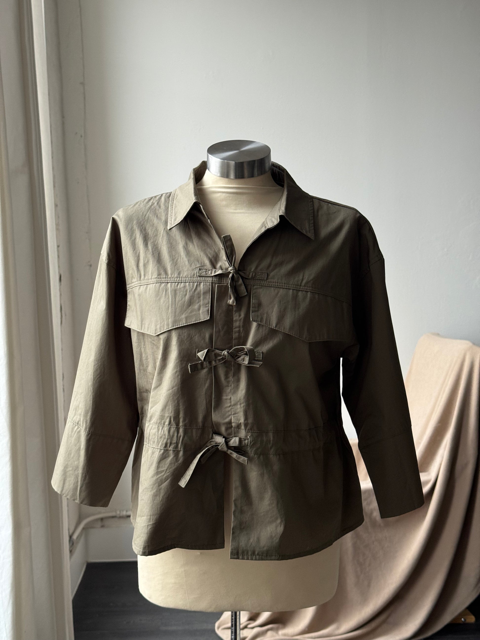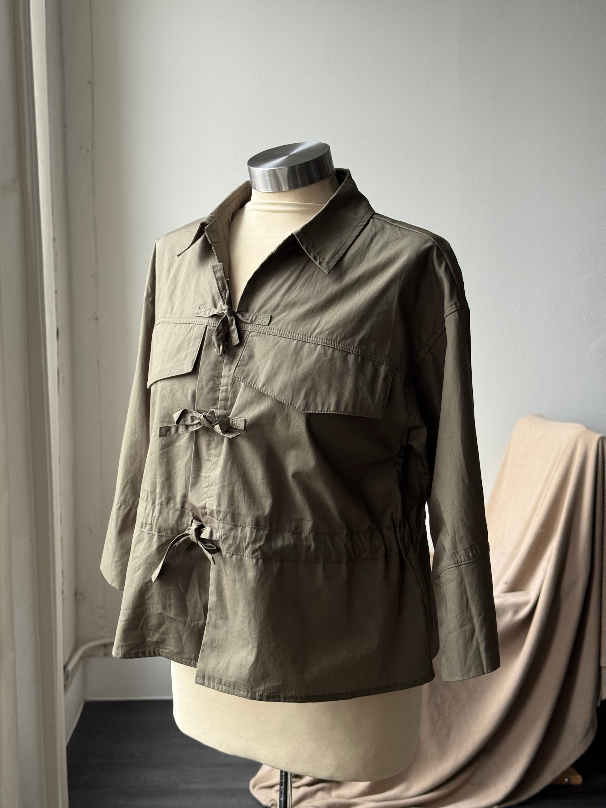 A structured yet easy cotton top with subtle military inspiration. Designed with a crisp collar and tailored front details, this piece features flattering three-quarter sleeves for effortless, everyday wear. The breathable cotton fabric gives it that broken-in feel while maintaining a clean, polished look—perfect for layering or wearing on its own. A timeless staple that pairs beautifully with denim, trousers, or skirts for a quietly confident, utilitarian edge.